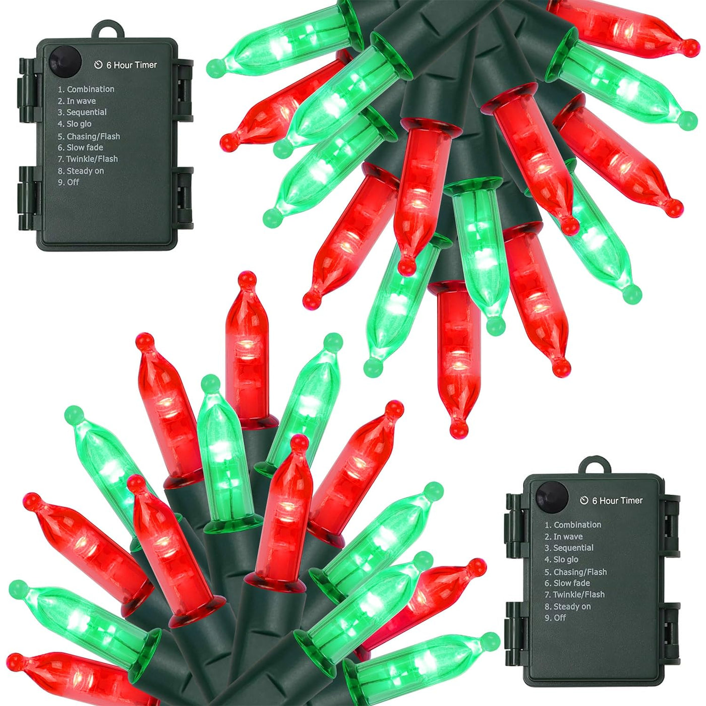 WATERGLIDE 2 Pack 50 LED Outdoor Christmas Lights, Battery Operated Mini String Lights with 8 Lighting Modes & Timer Decorate with our 2 pack 16ft Christmas decorative mini string lights with 50 Red & Green individual LED bulbs, will give a soft festive feel to your Christmas. Ideal for Christmas, Halloween, Valentine's Day, party, wedding, home, window, bathroom, festival, Holiday, shows, restaurant, hotel, commercial building, shopping center etc. Each string is full wave rectified, which eliminates any flickering making these LED Christmas lights brighter than ordinary LED mini Lights. Comes with built-in auto timer function without setting (6 hrs ON, 18 hrs OFF), to avoid forgetting to turn off the Christmas lights. Battery box to the first LED light: 1ft. Total length(lights string and leading line): 17ft.
