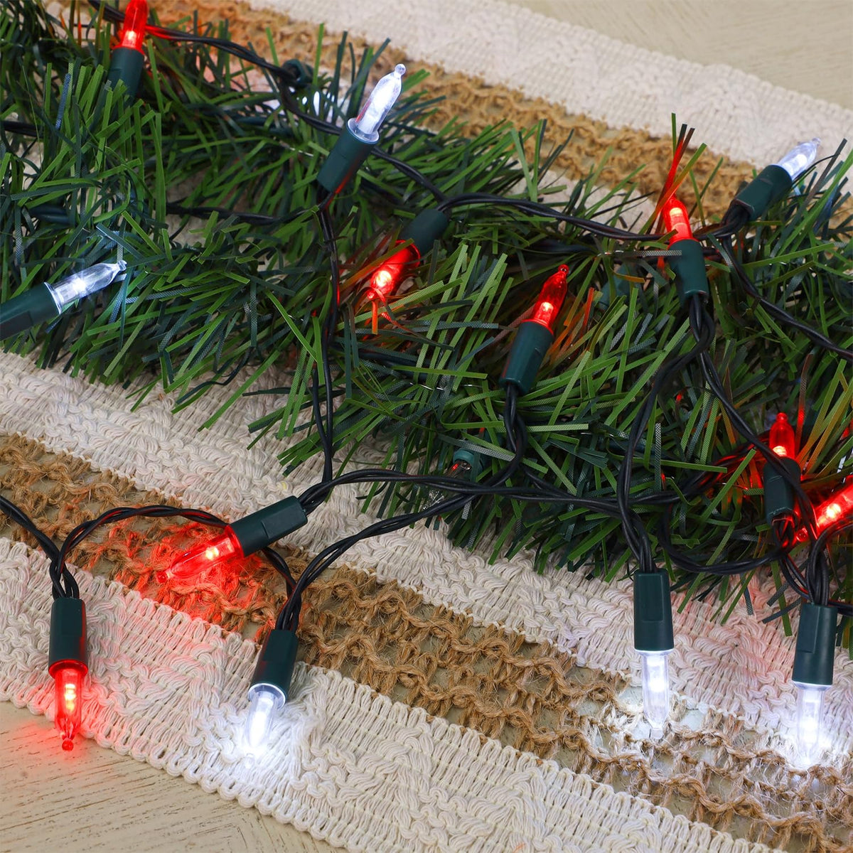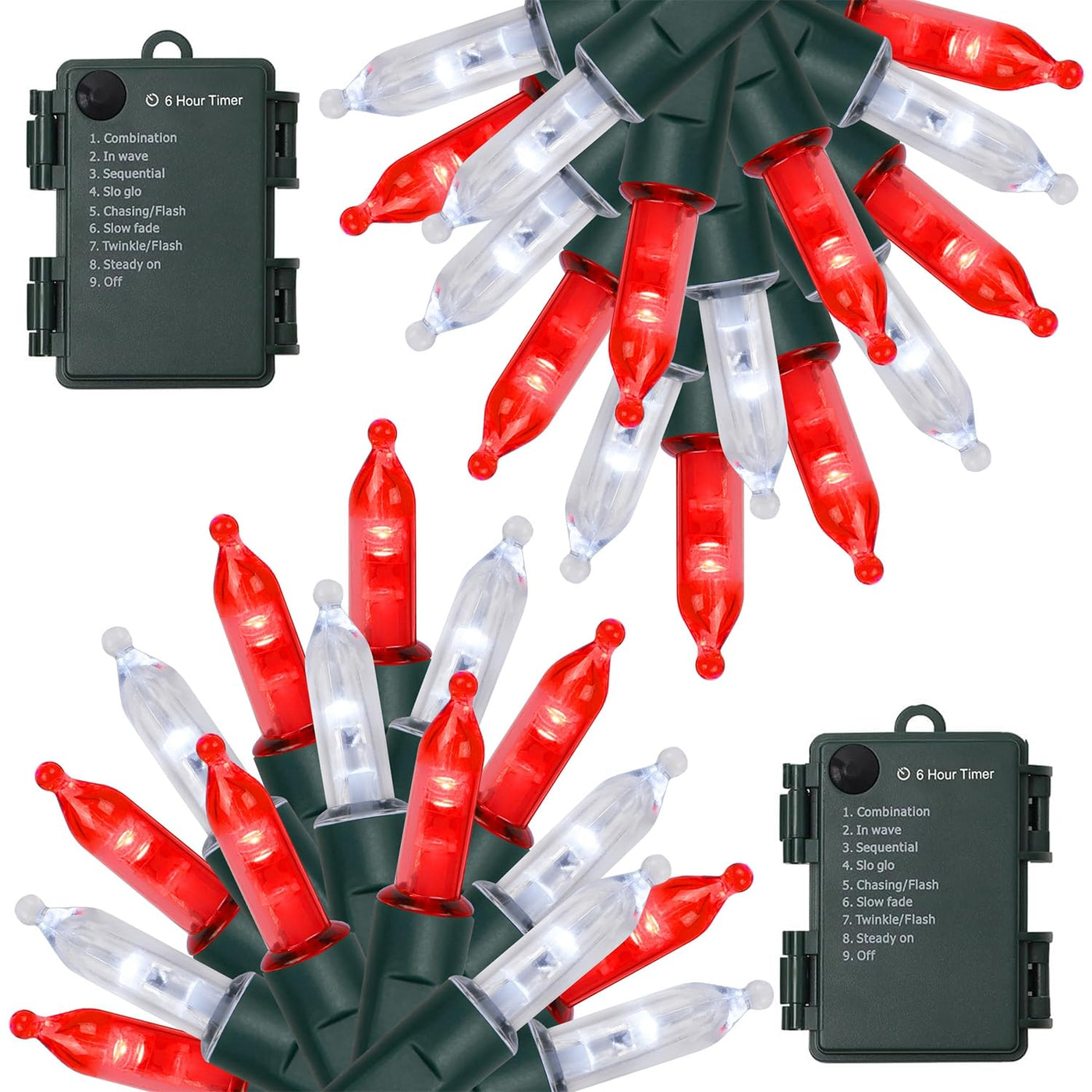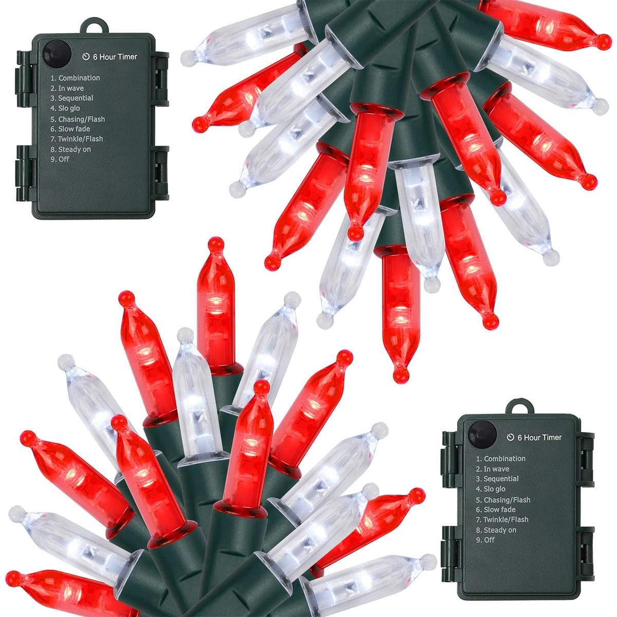 Specifications: Light Color: Red & White LED Count: 50 pcs Each Total Length (end to end): 17FT Each String lights: 16FT Each Waterproof Level: IP44 Power Supply: Battery Powered Timer: 6 hours on and 18 hours off Package Including: 2 x 50 LED Red & White Xmas Mini String Lights