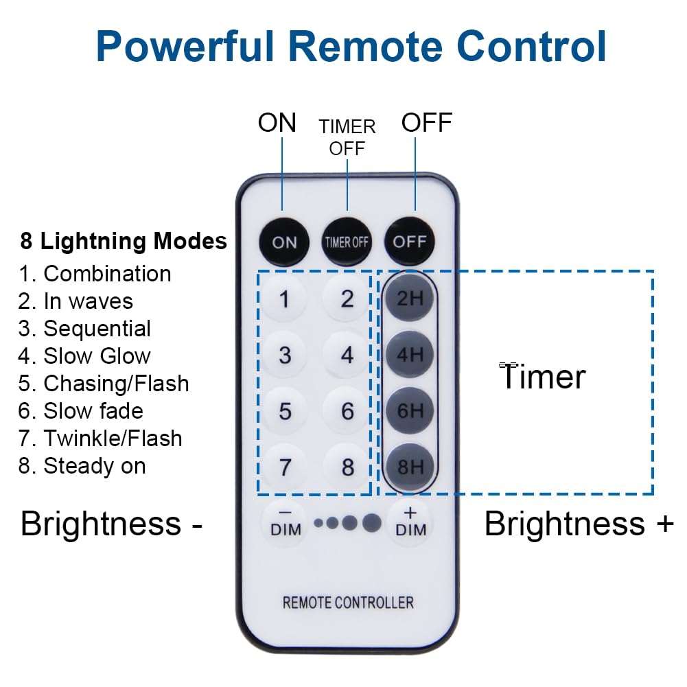 Q: What are the different lighting modes available with these lights?A: The lights offer 8 lighting modes, including combination, in waves, sequential, slogs, chasing/flash, slow fade, twinkle/flash, and steady on. You can easily switch between these modes using the remote control or the button on the mode controller.