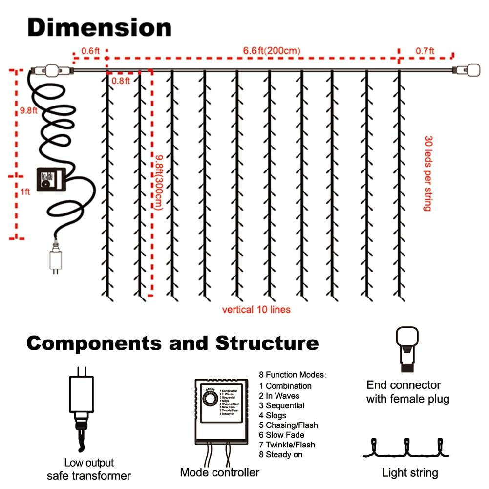 Specifications: Light Color: Warm White LED Count: 300 pcs Size: 6.6 x 9.8 FT Leading Wire: 9.8 FT Intervals Between light: 9.6 Inch / 0.8 FT Waterproof Level: IP44 Voltage: 110V Output: 29V safe low voltage Power Supply: Adapter Powered Package Including: 1 x 300 LED Window Curtain String Lights