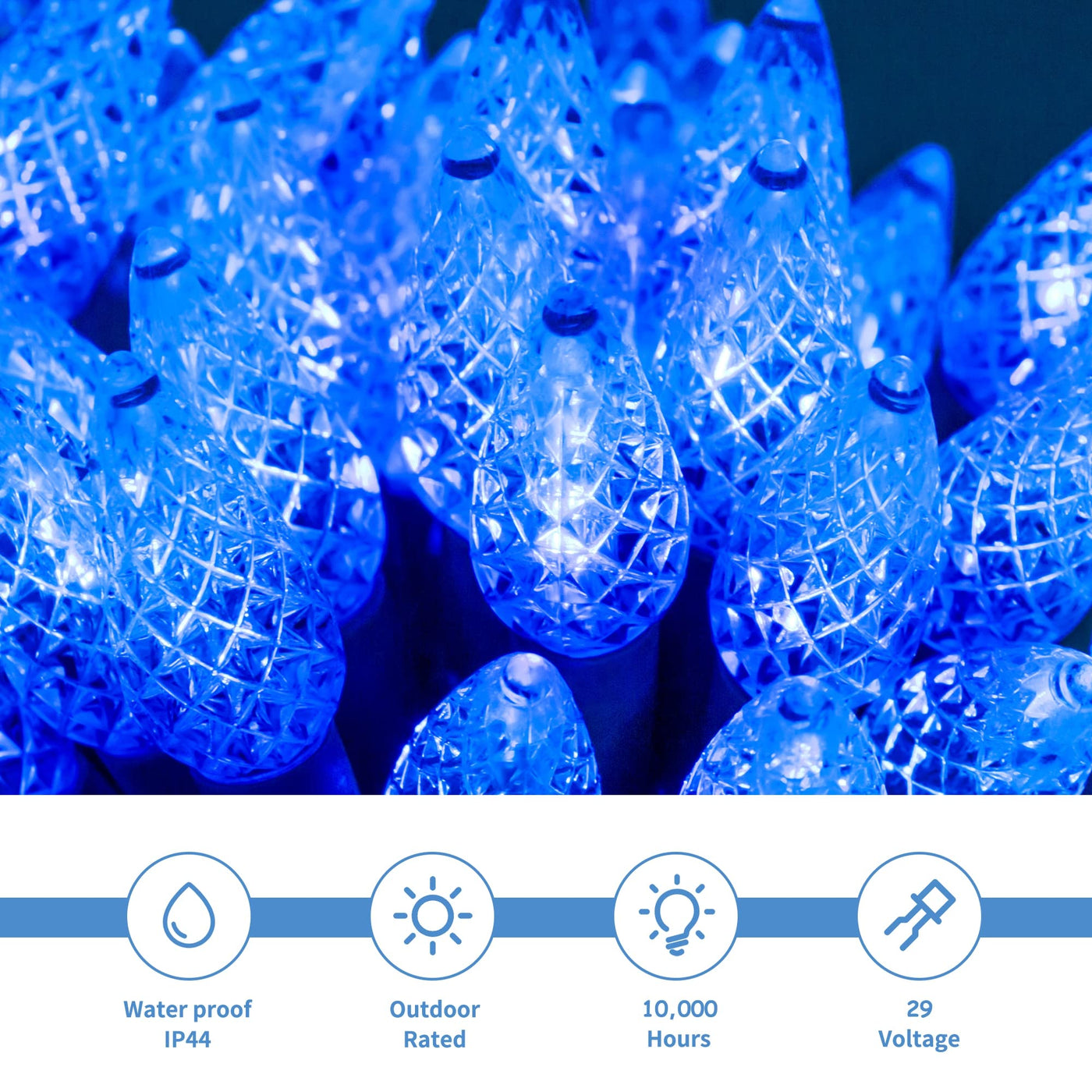 Enhance your holiday decor with the WATERGLIDE Blue Christmas C6 String Lights. Designed for both indoor and outdoor use, these decorative lights create a festive atmosphere perfect for Christmas, parties, weddings, and various celebrations.