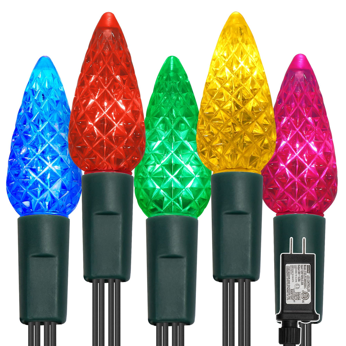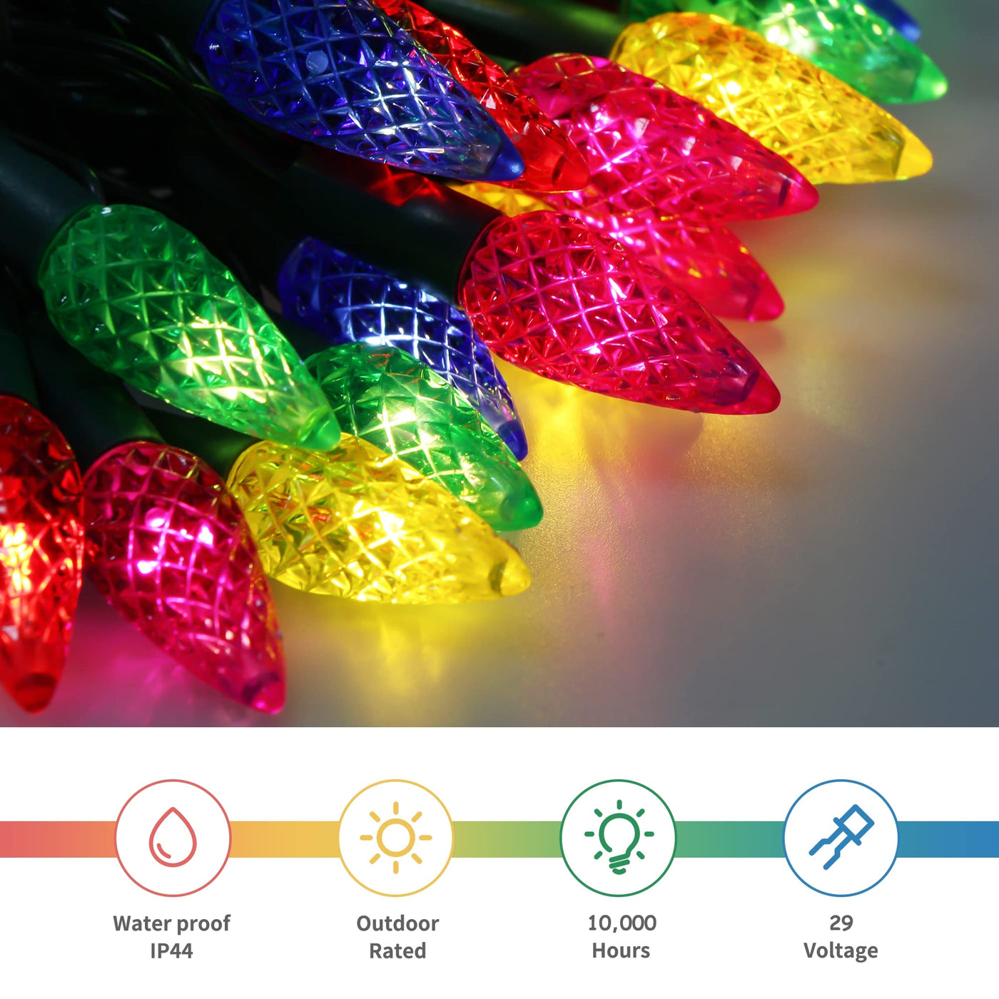 Waterglide C6 Christmas Lights, 33Ft 100 Led Faceted String Lights Green Wire Fairy Lights With 29V Safe Adaptor, 8 Lighting Mod
