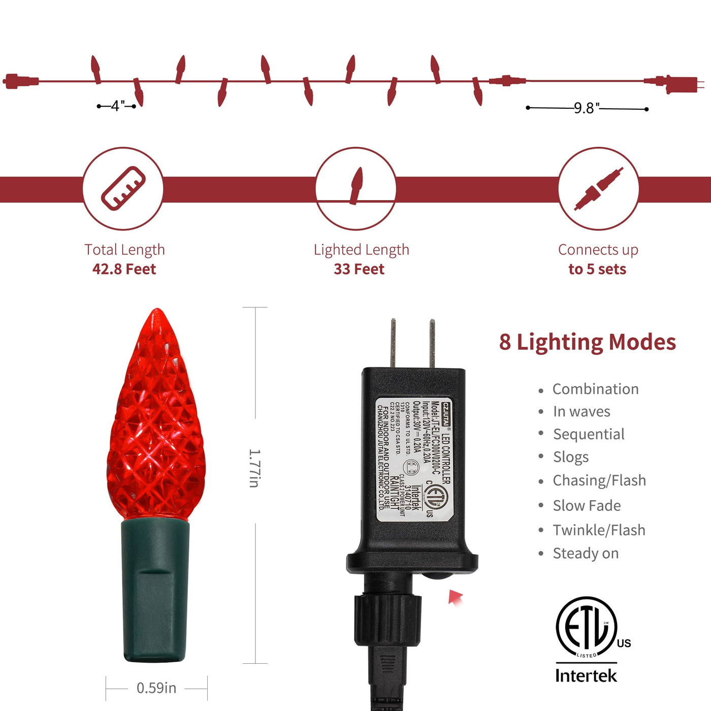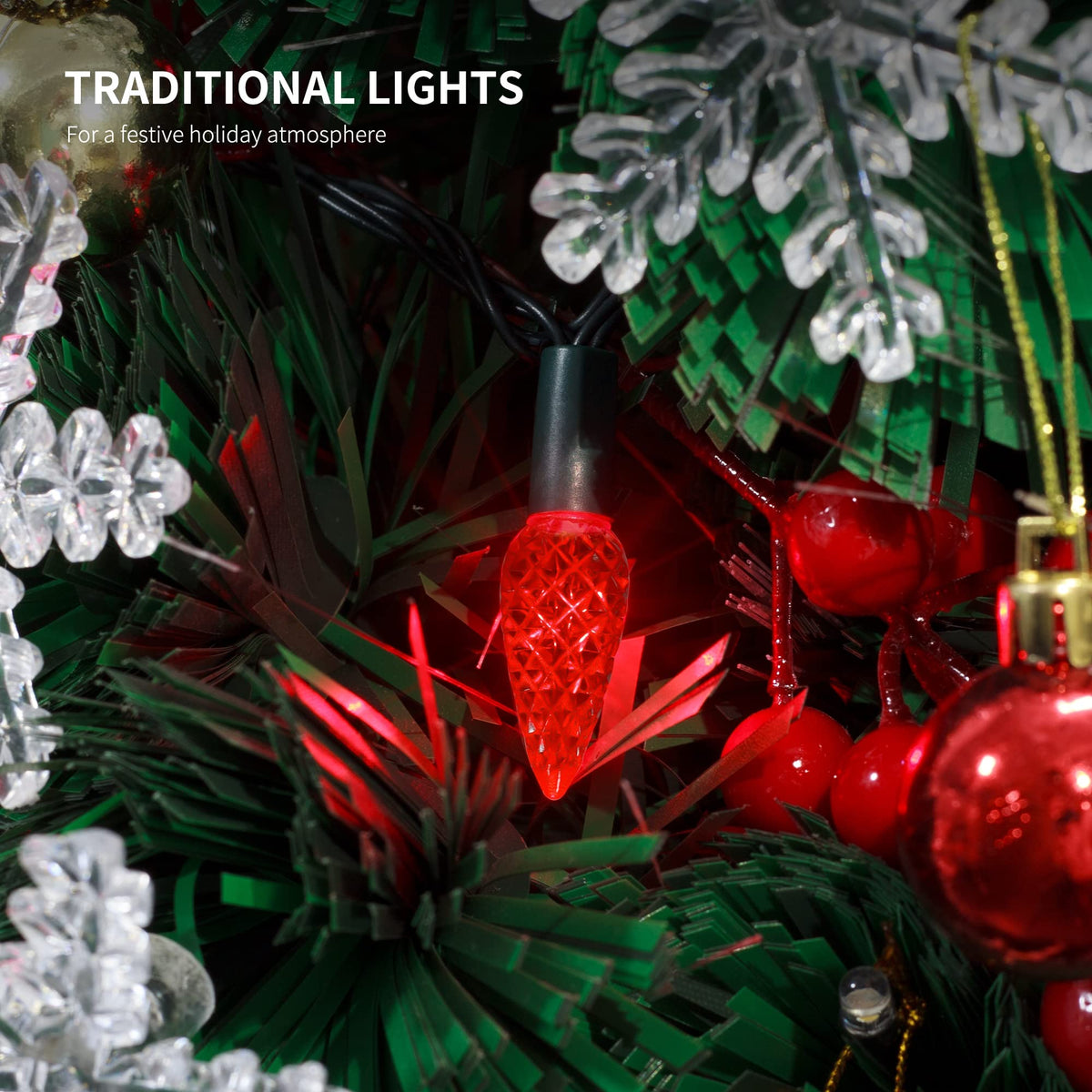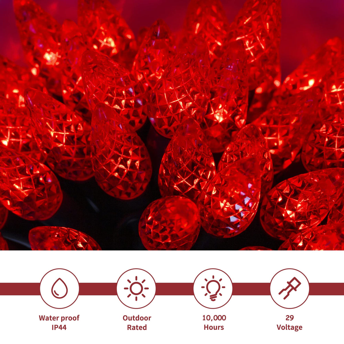 WATERGLIDE Red Christmas C6 String Lights 33ft Christmas decorative faceted strawberry C6 string lights with 100 red individual LED bulbs. Perfect for indoor and outdoor Xmas decorations. Perfect for Christmas, party, Valentines Day, Thanksgiving, Halloween, wedding, home, window, bathroom, festival, Holiday, shows, restaurant, hotel, commercial building, shopping center etc. Each string is full wave rectified, which eliminates any flickering making these LED Christmas lights brighter than ordinary LED mini Lights. High bright and luminous intensity, good heat dissipation, low light decay, and create romantic life for you. Adapter to the first LED light: 9.8ft. Total length(lights string and leading line): 42.8ft. Specifications: Light Color: Red LED Count: 100 pcs Total Length (end to end): 42.8FT String lights: 33FT Waterproof Level: IP44 Voltage: 110V Output: 29V safe low voltage Power Supply: Adapter Powered Package Including: 1 x 100 LED Red C6 String Lights Notes: 1. The power adapter is waterproof IP44, so it can meet normal use outside but not enough to put under water directly, It is recommended to use a waterproof receptacle cover when outdoor use. 2. Please make sure the male or female connectors are connected correctly. If you can not turn on the whole light, it may caused by the false connection for the connectors, please disconnect them and change another direction to connect them again.