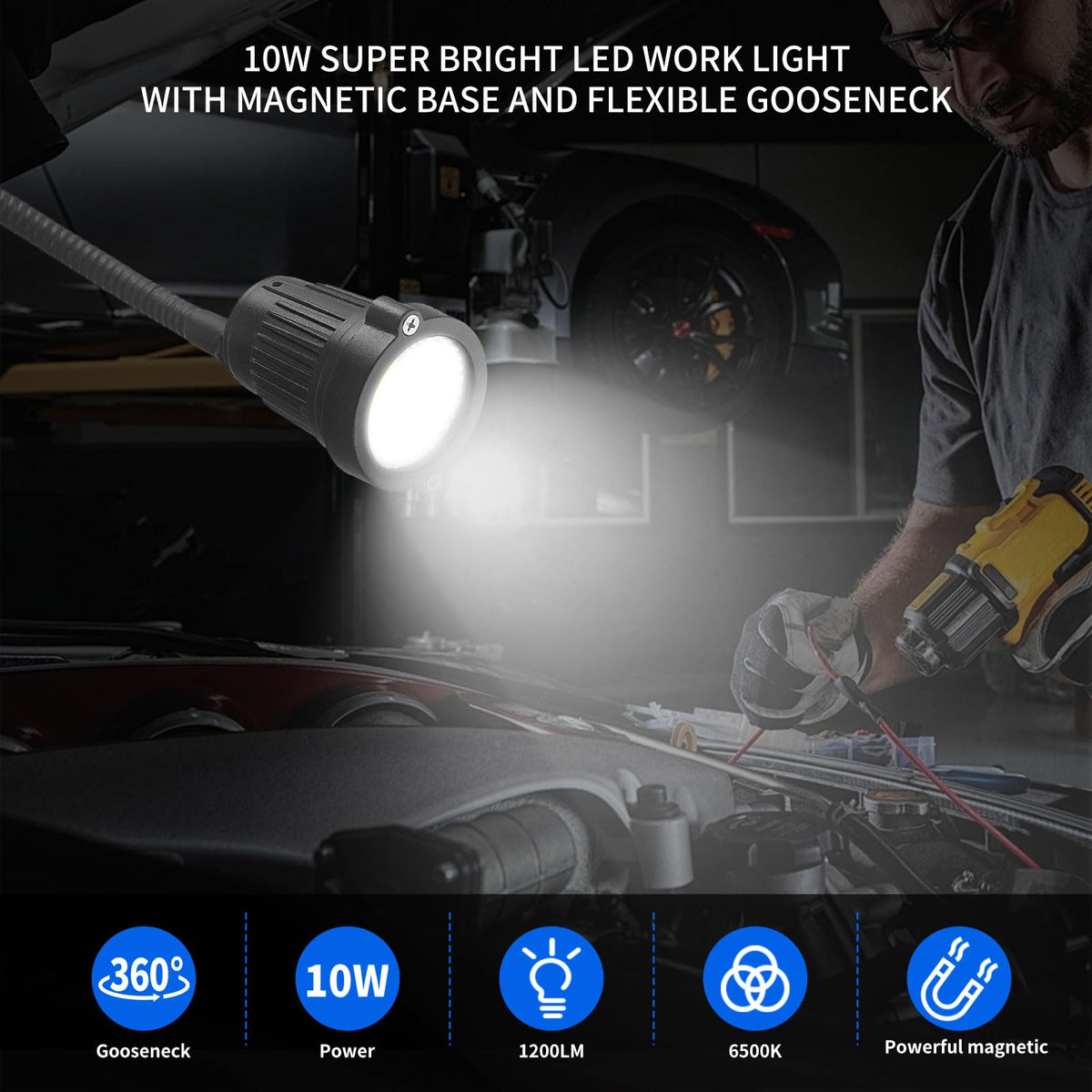 10W Waterproof Magnetic Light,Magnetic Led Work Light With Flexible Gooseneck And Magnetic Base, Magnetic Led Lamp 1200 Lumen For Work Bench, Ledsewing Machine Light, Auto Repairing, Grill Lighting, Reading Lighting Product Name: 10W Powerful Magnetic Base Led Flexible Gooseneck Work Light. Light Material: Stainless Steel + Plastic Head Size: 3 X 3 Inch Gooseneck Length: 20 Inch Power Cord Length: 60 Inch Package Size: 10.04 X 7.99 X 2.8 Inch Package Weight: 2 Pound Working Power: 10 W Input Voltage: Between 110V To 240V Color Temperature Range: Between 6500K Luminous Flux: 1200 Lumens Light Source Type: Led Number Of Led Beads: 3 Led Beads Life: More Than 50,000 Hours Light Color: White Plug Type: American Safety The Two-Pin Plug Function:Magnetic Base, Flexible Gooseneck Package Included: Machine Light X 1 Product Certification: Ce. Fcc. Rohs Product Features: Strong Magnetic Base: Wall Mount Work Light Can Be Solidly Attached To Any Steel Surface Such As Workbench, Lathe, Drill Press And Milling/Sewing Machine. No Need To Worry It Will Sagg Or Fall Down During Working. Safe And Vison Protection: No Radiation, Zero Flicker And Not Dazzling. Longer Service Life Energy Saving: 90% Energy Saving Comparing To The Traditional Light And Up To 50,000 Hours Life Expectancy 360 Rotation Gooseneck: Easily To Be Adjusted To Any Accurate Angle For Your Specific Work Plastic + Acrylic Sealed Lampshade: The Lampshade Is Made Of Plastic + Acrylic For High Strength And Durability, Ip65 Waterproof. 12-Month Warranty:No Satisfied, Free Reason For Return; We Could Also Resent You New One Due To Quality Problem. Please Feel Free To Contact Us And ''Ask A Question'' And We Will Be Online 24 Hours A Day. Scope Of Use: Uses Include But Are Not Limited To Cnc, Lathes, Milling Machine, Drilling Machine, Punching Machine, Woodworking, Workbench, Auto Repair Shops, Stores, Band Saws, Tools, Stove.