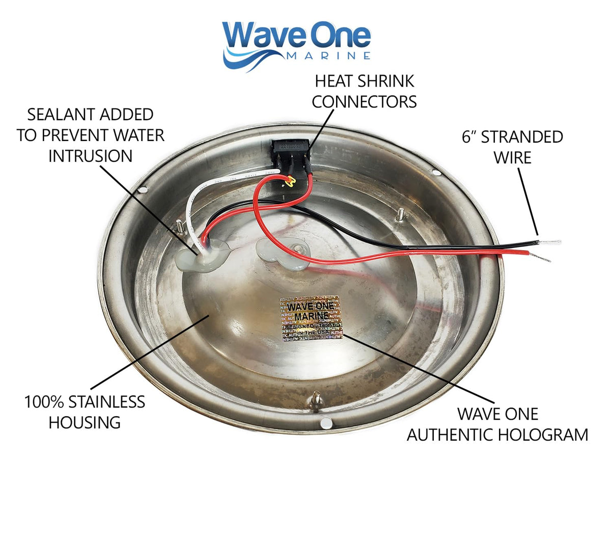 Our Wave One Marine dual color marine grade dome light was designed through years of owning hundreds of boats that needed a better dome light at a reasonable price. We designed this light with a beautiful mirror polished stainless body & stainless hardware that is included for easy installation. Our dual color light is an easy upgrade due to our onboard switches. You can utilize your existing wiring (single +/- wire) and switch between colors directly on the light. Most importantly its designed to survive in marine conditions. You cant find a better dual color dome light for your boat, rv, truck, car, or shop for the price. Measurements / Specs: 36 Bright LED'S 9-15.2 Volt Input Current Draw Approximate (1A@13.5V) | Power Consumption = 8 Watts Accent / 20 Watts White at 13.5V Operating Temperature -22F to 122F LED Expected Life Of Over 25,000 Hours Dimensions : 6.875'' Diameter, 2'' Height, Wire Length : 6 Approx 150 Lumens White / 75 Lumen Accent Color Output (Approximate | Voltage Dependent)