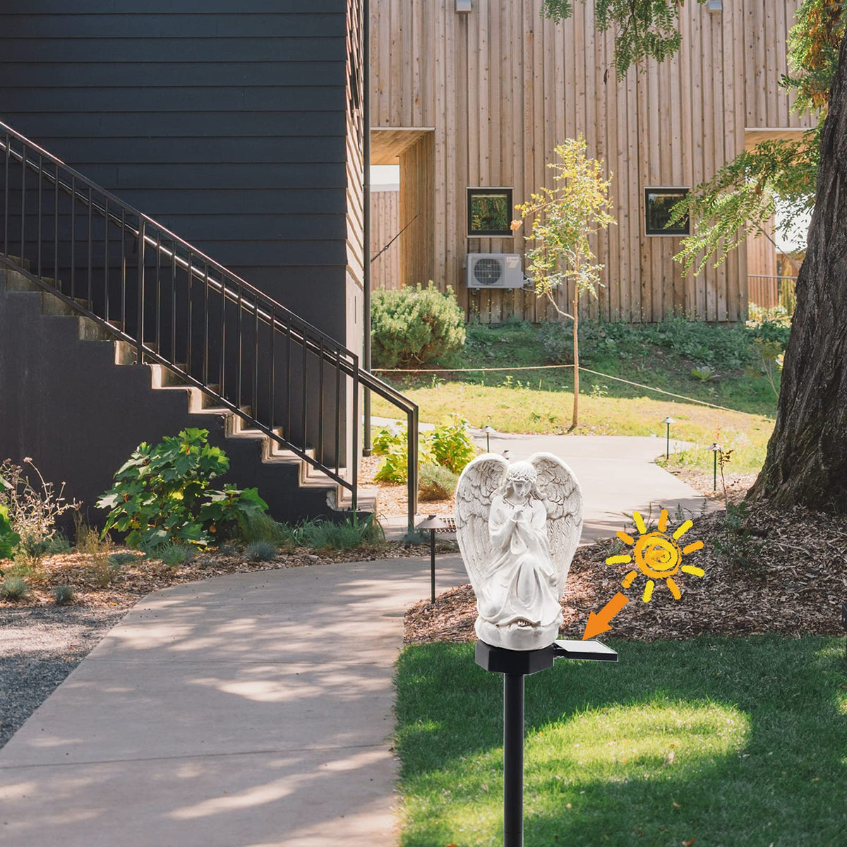 Q: What are the best places to use the WAYDA Solar Light?A: The WAYDA Solar Light is perfect for decorating various outdoor areas such as gardens, lawns, aisles, porches, yard paths, and walkways. Its beautiful angel design adds a charming touch to memorial spaces or any outdoor setting.