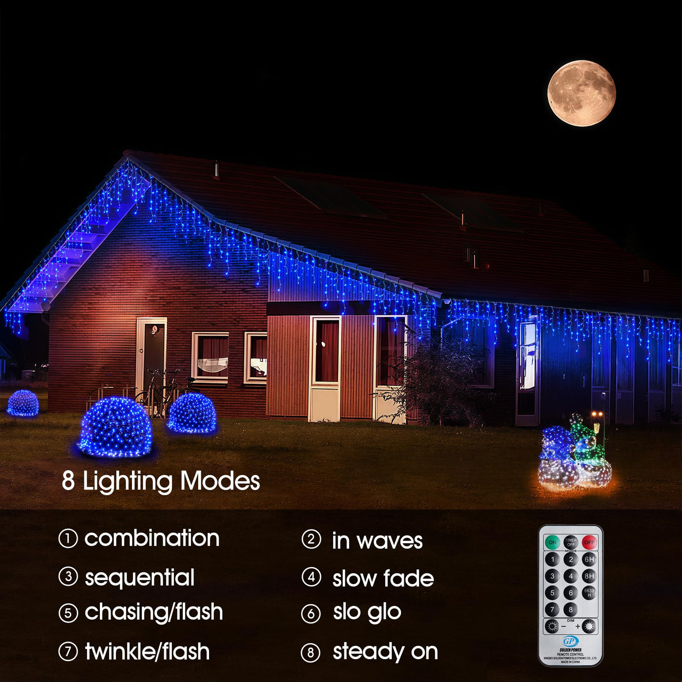 Q: What are the different lighting modes available for the WBao Icicle Lights?A: The WBao Icicle Lights feature 8 different lighting modes, allowing you to customize the ambiance for various occasions such as Christmas, Halloween, and weddings.