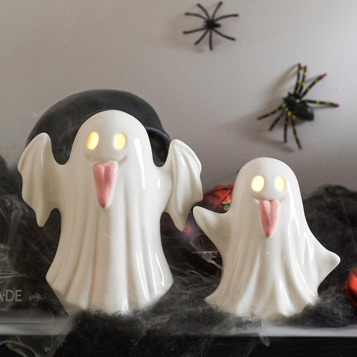 WDS WONDROUS ceramic ghost figurine set includes two light-up Halloween ghost statues in walking poses. Made of durable ceramic with playful white ghost shapes and pink tongues, these halloween ghost lights glow from the eyes and mouth when lit. Ideal for ghost decor lovers, they fit perfectly on mantels, trays, shelves, or desks. Add charm and character to your Halloween decorations indoor with these cute ceramic ghost decorations.