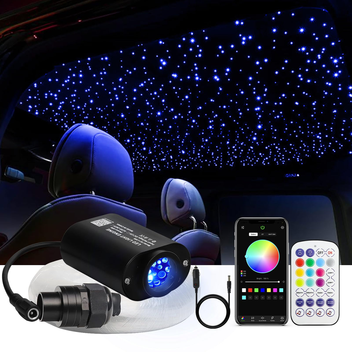 WEBUPAR 6W Car Twinkle Fiber Optic Starlight Headliner Kit, 400pcs, Multi-color, Model QJ-L006, Sound-Activated with APP & Remote Control