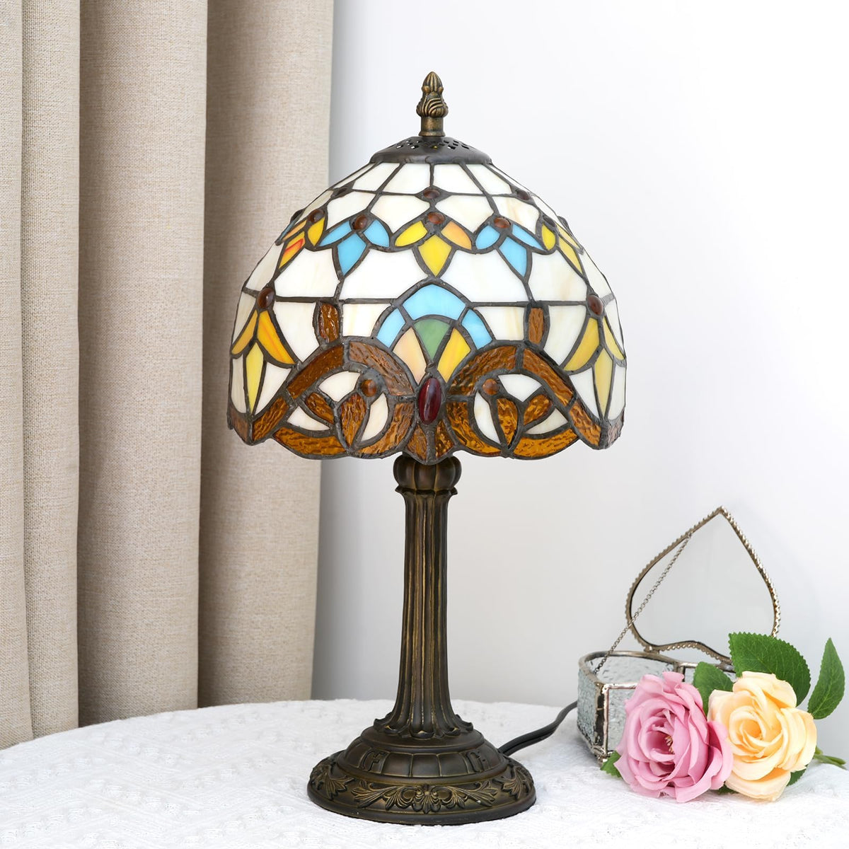 Stained Glass Lamp:The Base Is Made Of Resin. Sturdy And Durable The Total Weight Is About 0.6Kg. Power Cord Length Is 1.55M Easy To Install - Easy To Assemble And Can Be Completed Without Any Tools. Comes With 1 E26 Bulb 12W 3000K. Real Stained Glass Lamp Shade:Measuring Approx. 8 Inches (20Cm) Wide By 14 Inches (36Cm) High Takes Up Little Space And Is Handmade. Baroque:Table Lamp An Ideal Bedside Table Lamp It Is Not Only Suitable For Reading Lighting But Also Suitable For Home Decoration And Can Also Be Used As A Collectible. Add Elegance And Creativity To Your Home. Create An Atmosphere Of Relaxation And Rest. Tiffany Lamp:Suitable For Bedrooms Guest Rooms Living Rooms Study Rooms ChildrenS Rooms For Girls And Boys Offices Desks Etc. Perfect For Decorating Anywhere In Your House. 90-Day Free Refund & 24-Hour Service:If Your Light Has Any Defects Or Stops Working You Can Contact Us At Any Time. We Will Help You Resolve The Issue And/Or Send Replacement Parts Or A Brand New Product.