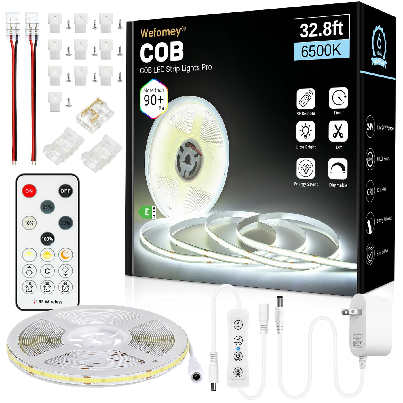 Wefomey Cob Led Strip Light 32.8Ft Dimmable 6500K Super Bright Daylight White 24V Flexible Led Tape Light With Remote For Home Kitchen Diy Lighting