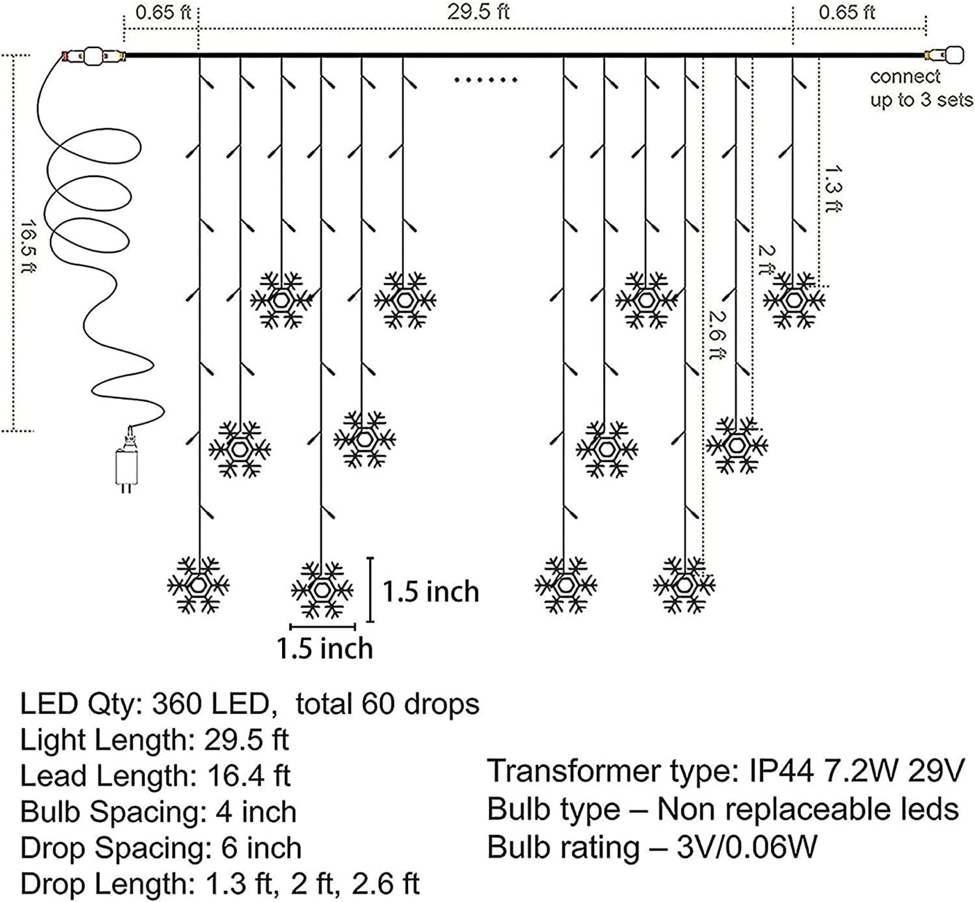 Expandable Length: Connect up to three sets of lights for a total of 88.5 feet of illumination.