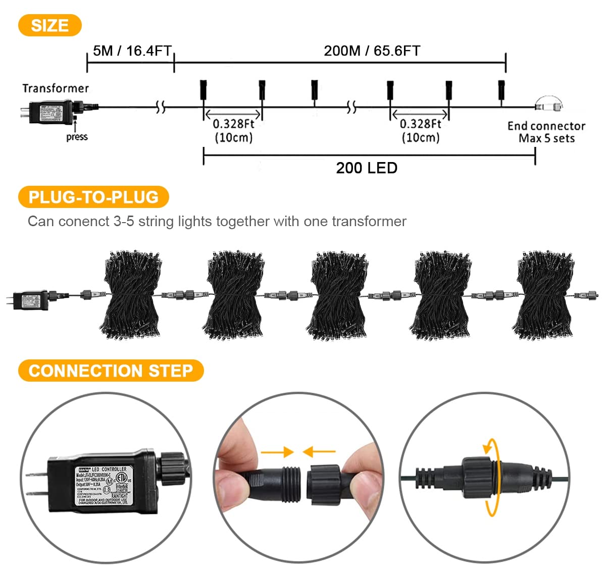 Connectable: Link up to 3-4 sets with the end-to-end plug for larger illuminating areas.