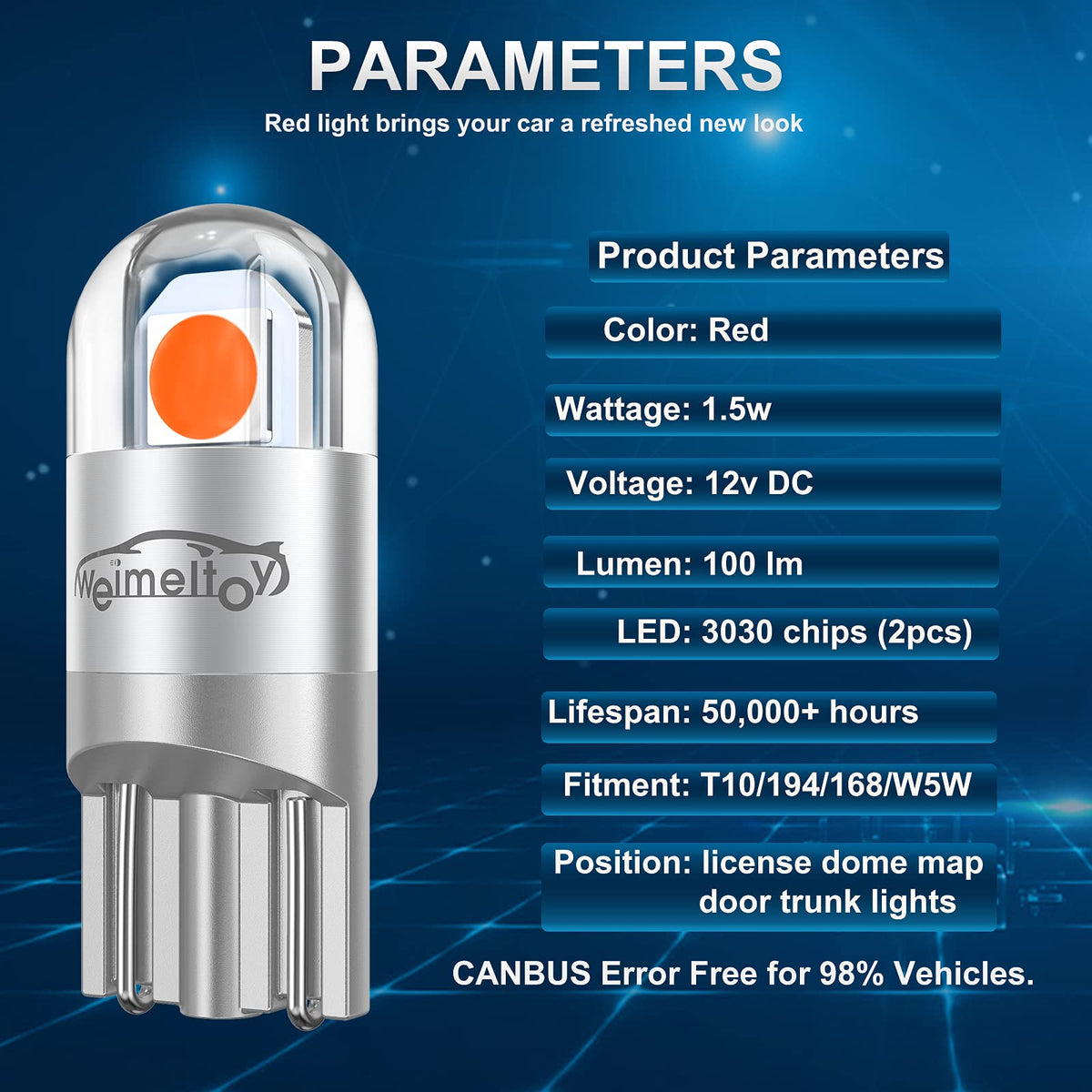 Weimeltoy 194 Led Car Bulb Red 3030 Chipset 2Smd T10 194 168 W5W Led Wedge Light Bulb 1.5W 12V License Plate Light Courtesy Step Lighttrunk Lamp Clearance Lights (12Pcs/Pack)…