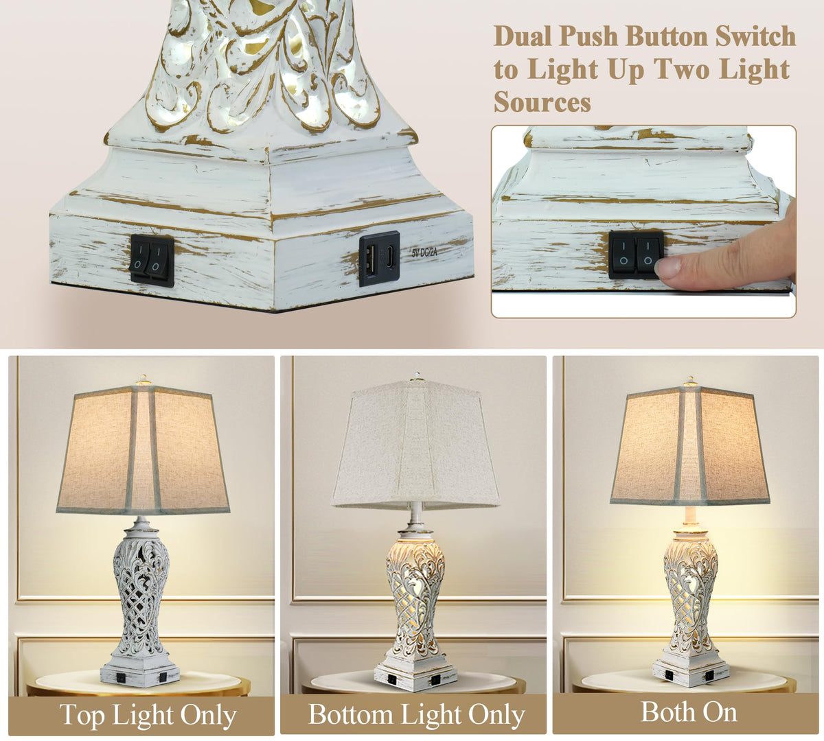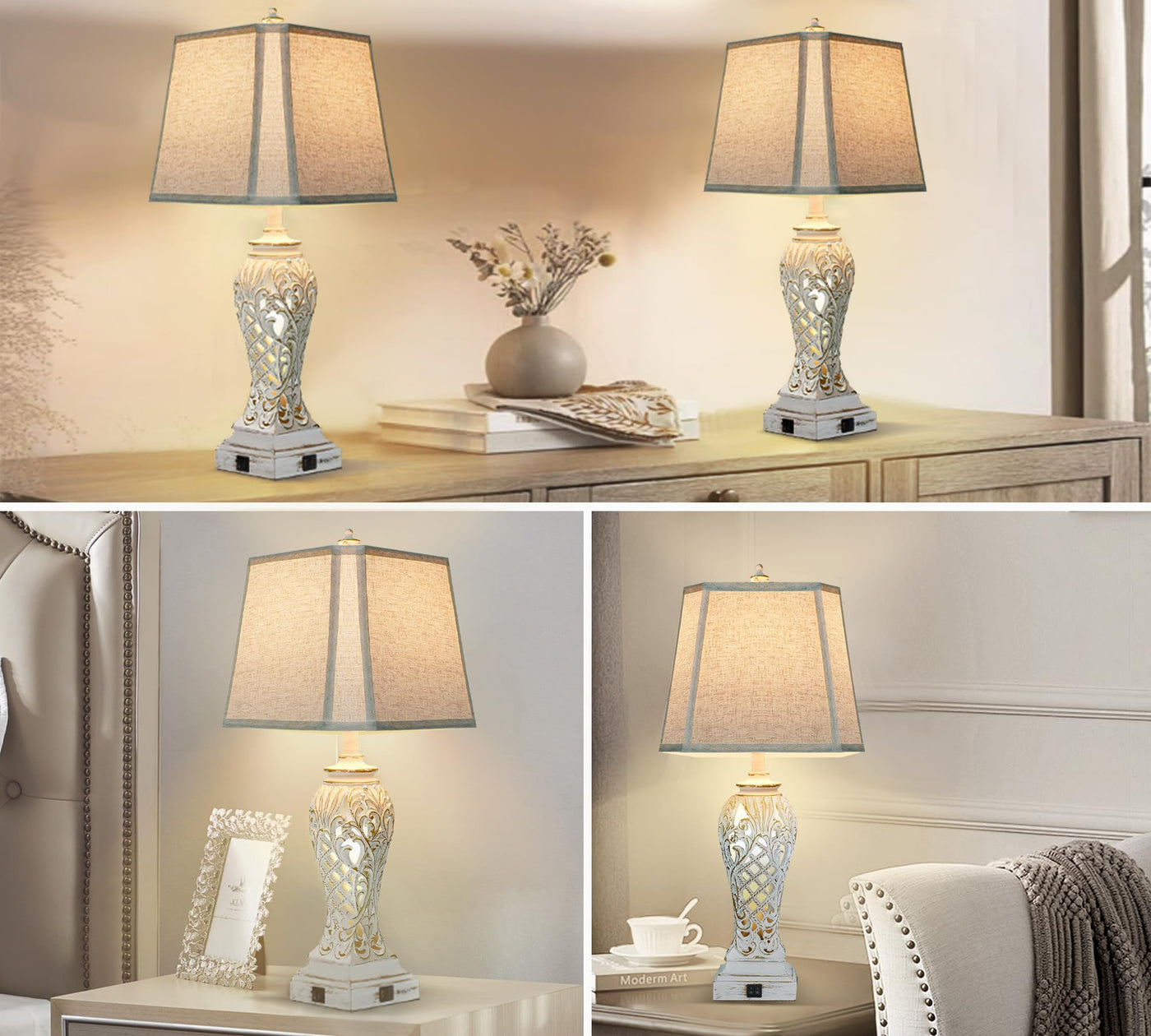 Q: What type of design do these lamps have?A: These lamps feature a white elegant farmhouse design with a unique hollow out structure, making them a beautiful addition to any rustic or modern decor.