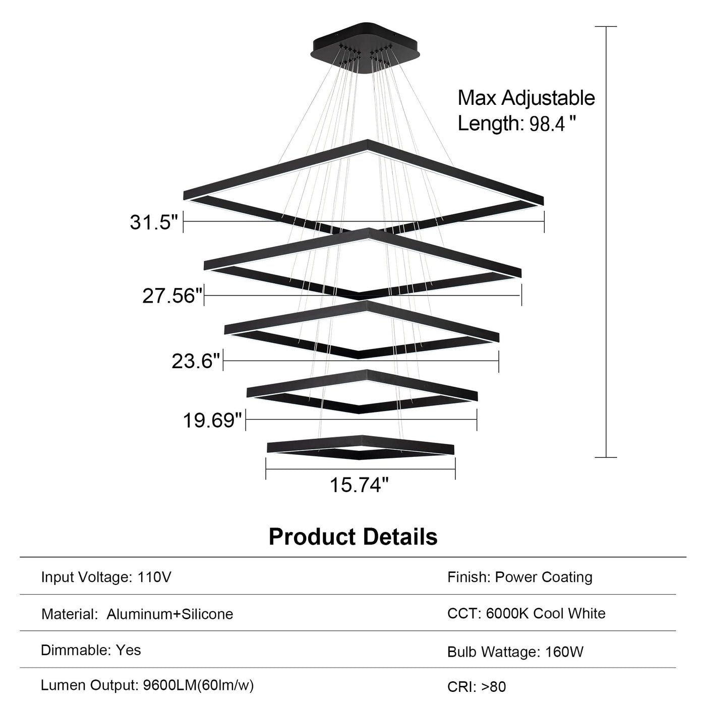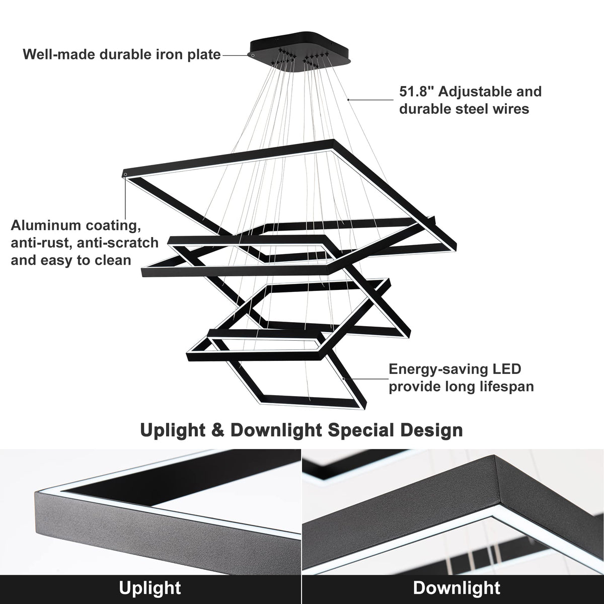 - **Elegant UPLIGHT & DOWNLIGHT Design**: Featuring a unique design with special uplight and downlight capabilities, this chandelier beautifully enhances the ambiance of your space. With five square rings, it’s perfect for creating a sophisticated atmosphere in any room, including entryways, living rooms, and restaurants.