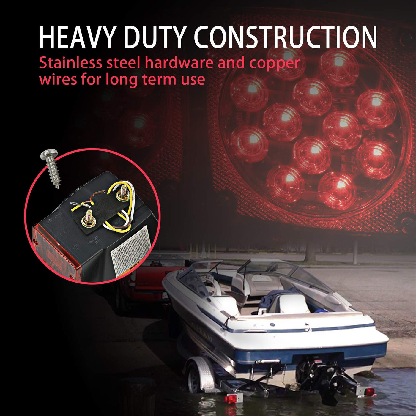 Trailer lights kit included: - Includes two 12V LED tail and turn signal lights, and stainless steel hardware. - Engineered using premium corrosion resistant materials. - Optimal LED light clarity Premium Quality Material: - All of our wires are all-copper instead of traditional copper coated aluminum wires. - Fully operable in inclement weather and rough terrain. 100% DOT compliant: - Lights are federally compliant for optimal visibility, durability and reliability. - Reduces the risk of liability in the event of property damage or personal injury. - Compliant lights prevent you from being ticketed during your travels. Cost effective and flexible light alternative: - Outfitted for trailers measuring up to 80 inches wide. - LED lights last 30-40 times longer than standard incandescent bulbs. - Replace your bulbs less often and maneuver your trailer with confidence.