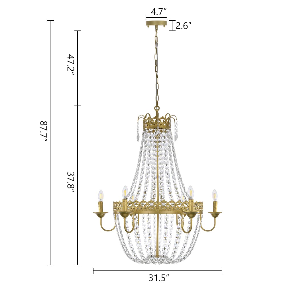 Elevate your home decor with the stunning Wellmet Empire Chandelier, a perfect blend of antique elegance and modern charm. This beautifully crafted chandelier features a timeless antique gold finish and intricate strands of faceted crystals that create a sparkling effect, making it an ideal centerpiece for any room.