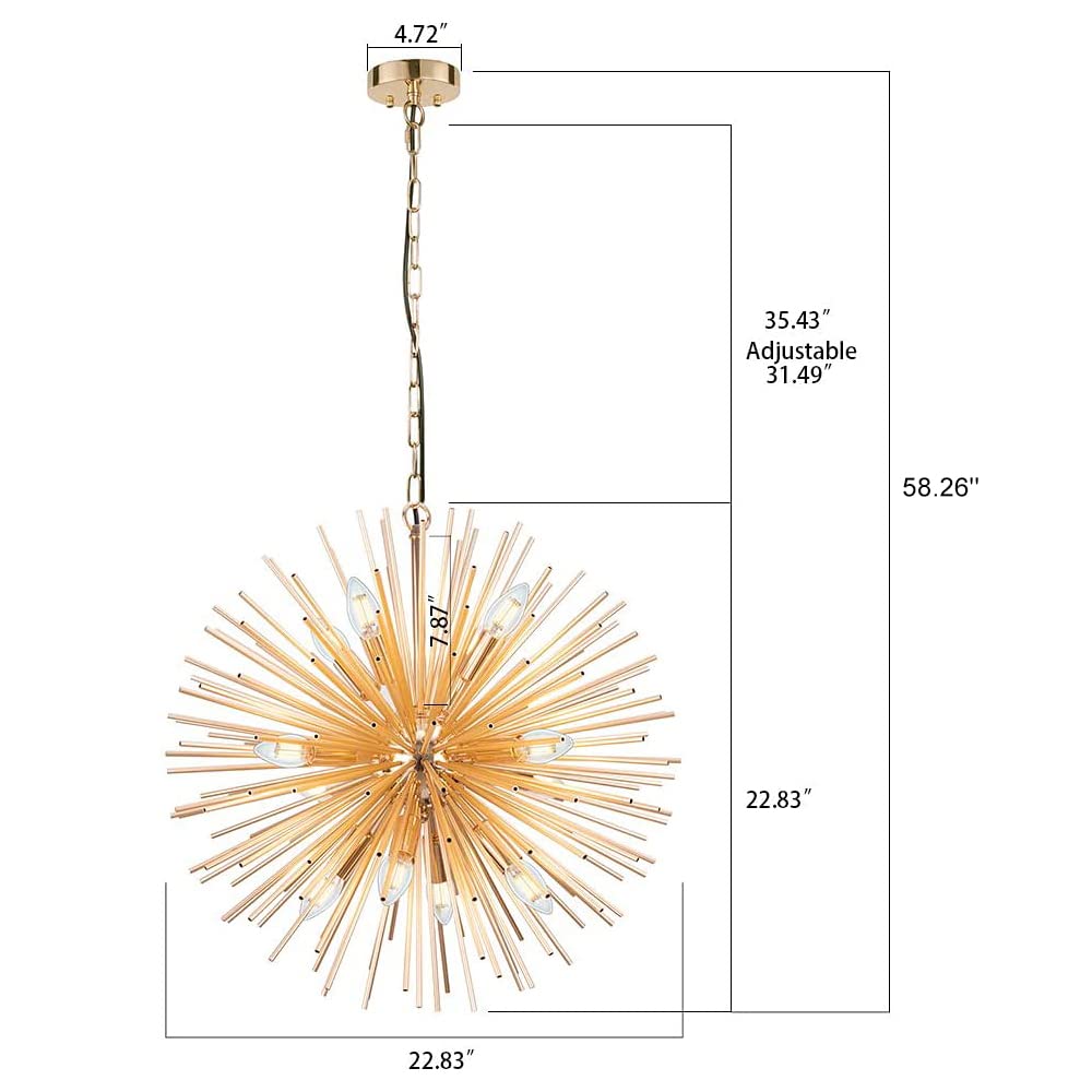 Q: What are the dimensions of the Wellmet Gold Sputnik Chandelier?A: The dimensions of the Wellmet Gold Sputnik Chandelier are a diameter of 22.83 inches, a metal chain length of 35.43 inches (with 31.49 inches adjustable), and a ceiling base diameter of 4.72 inches.