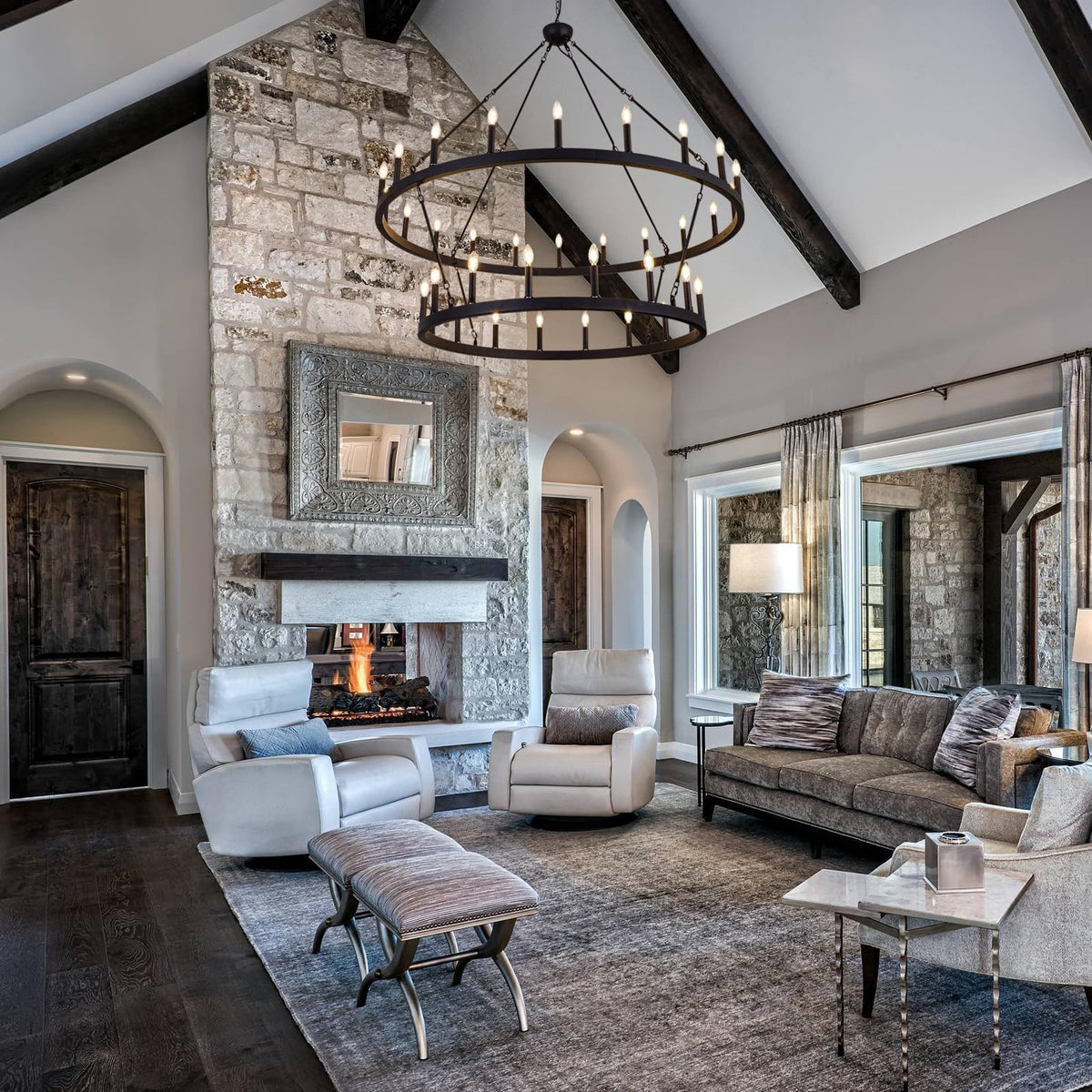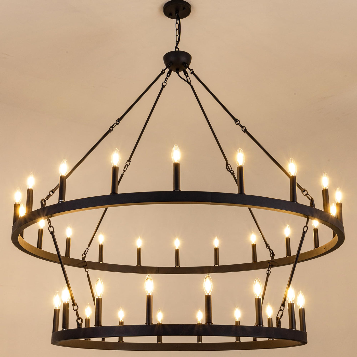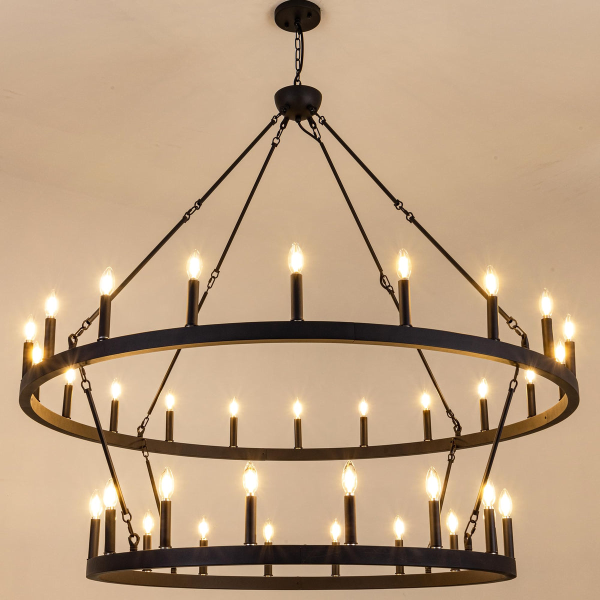 Large Farmhouse Chandelier: The 28-light tiered chandelier has a rustic tavern feel that s sure to bring some warm, inviting charm into your entryway. It s crafted with a large, open metal frame in a matte black finish, and it has two tiers that elevate any space with high ceilings it hangs in