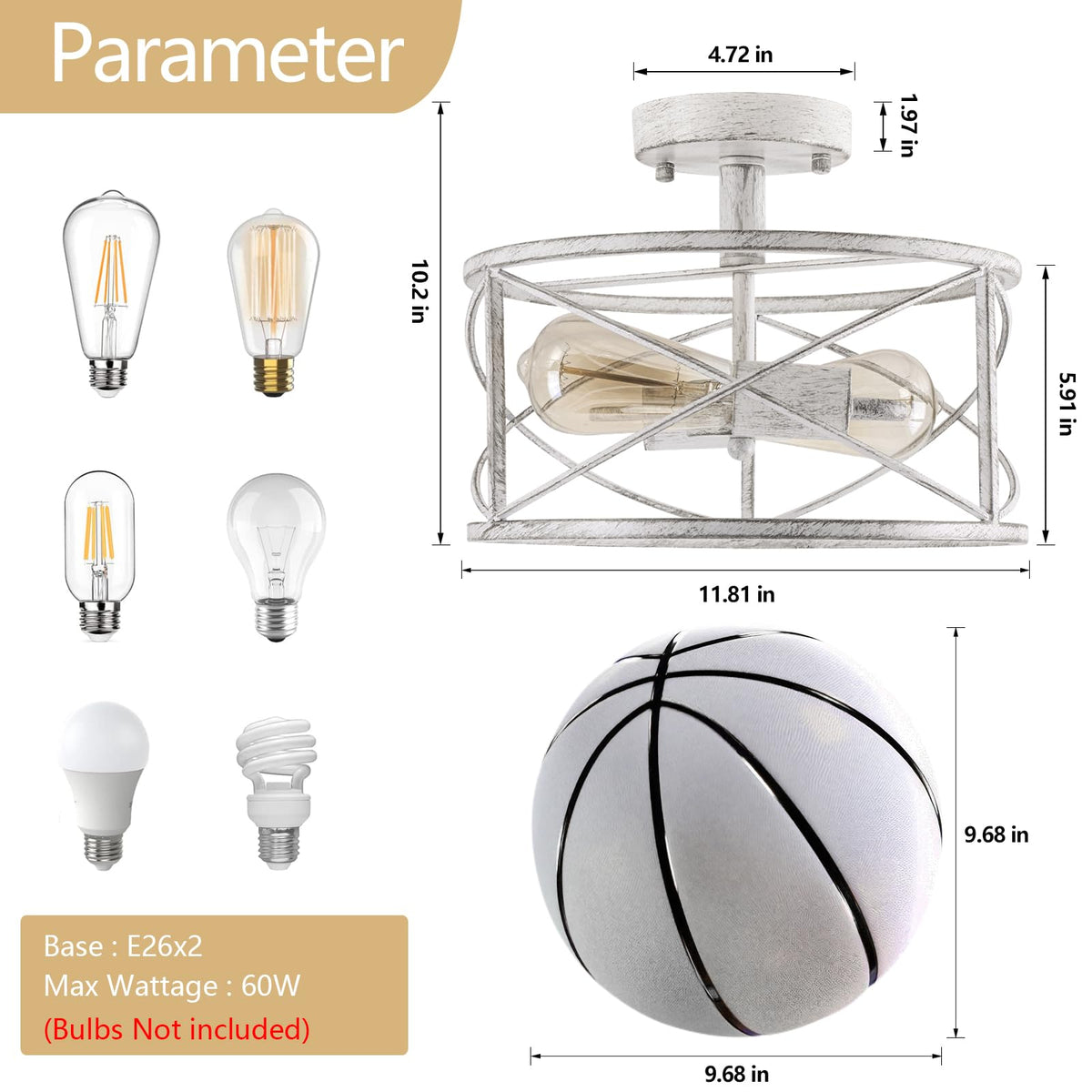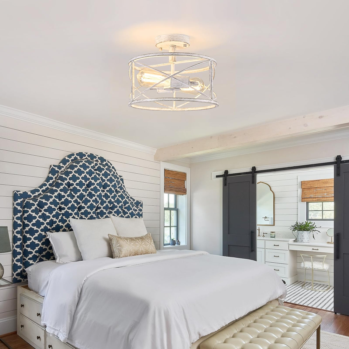 WELTRANS 2-Light Metal Cage Flush Mount Ceiling Light Fixture, White, Model JH6793-2PW, Ideal for Hallway, Bedroom, Kitchen, Living Room