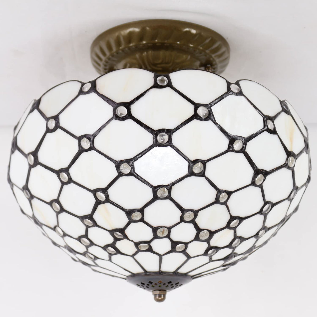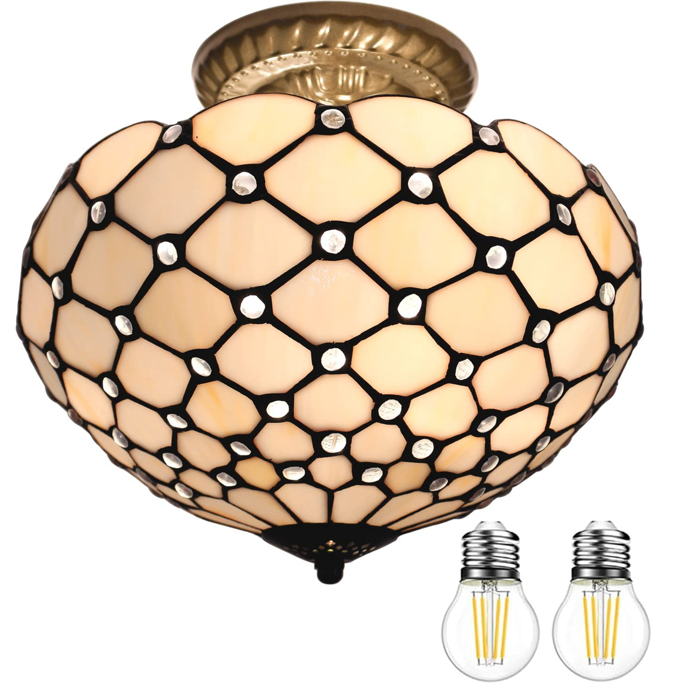 WERFACTORY Tiffany Ceiling Light Fixture, 12 Inch Semi Flush Mount Lamp, Cream Amber Stained Glass, S005 Series, 11 Inch Height