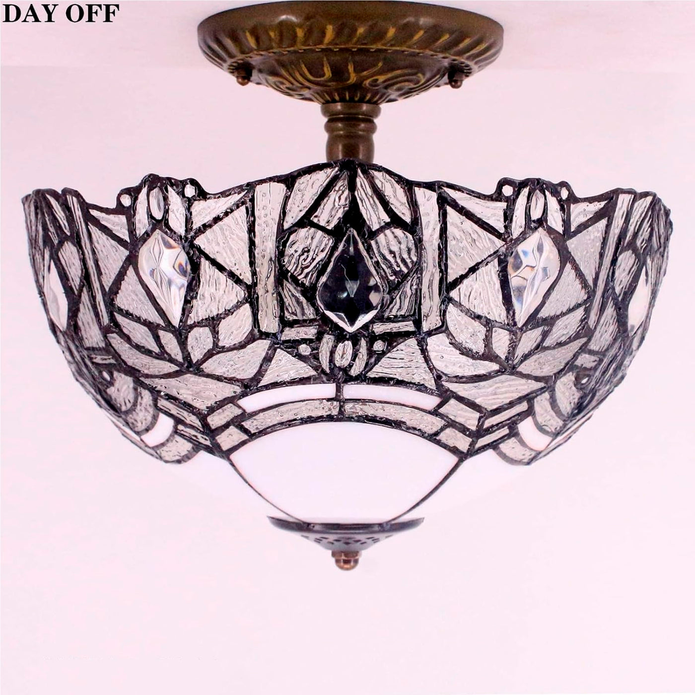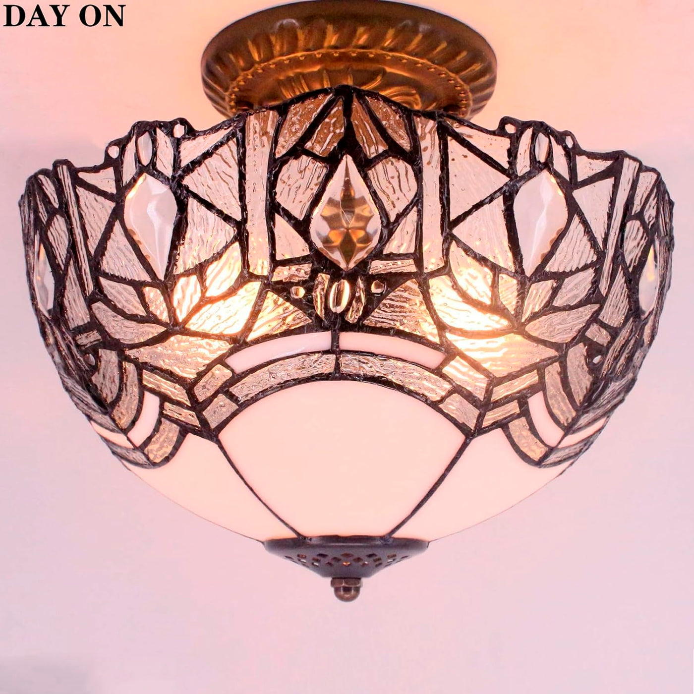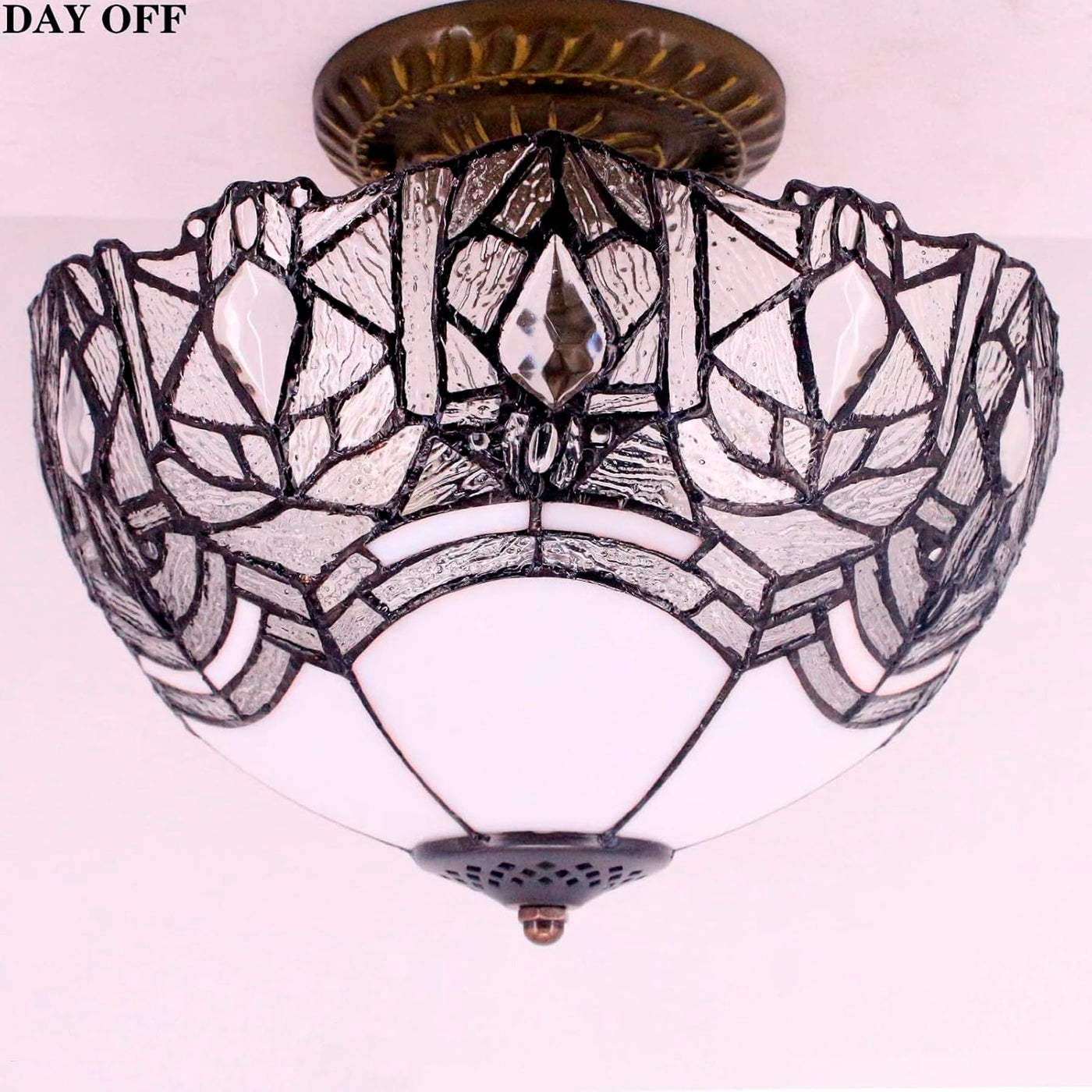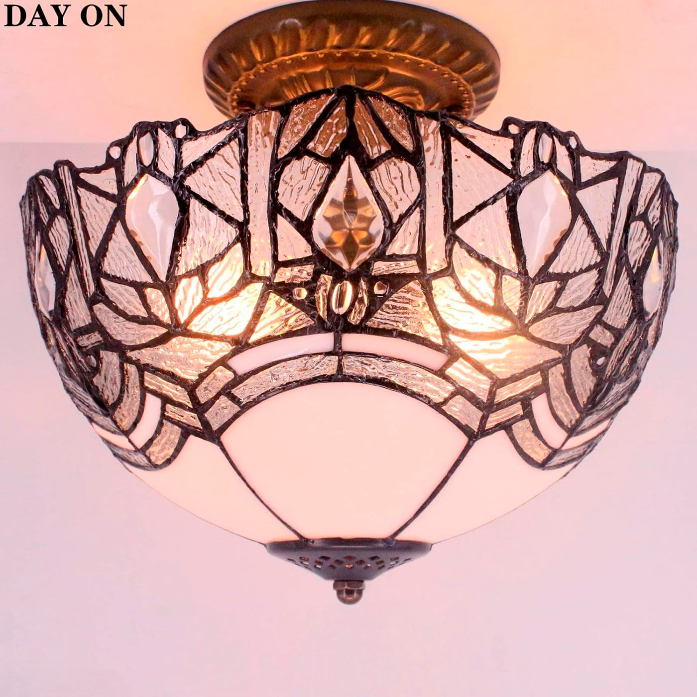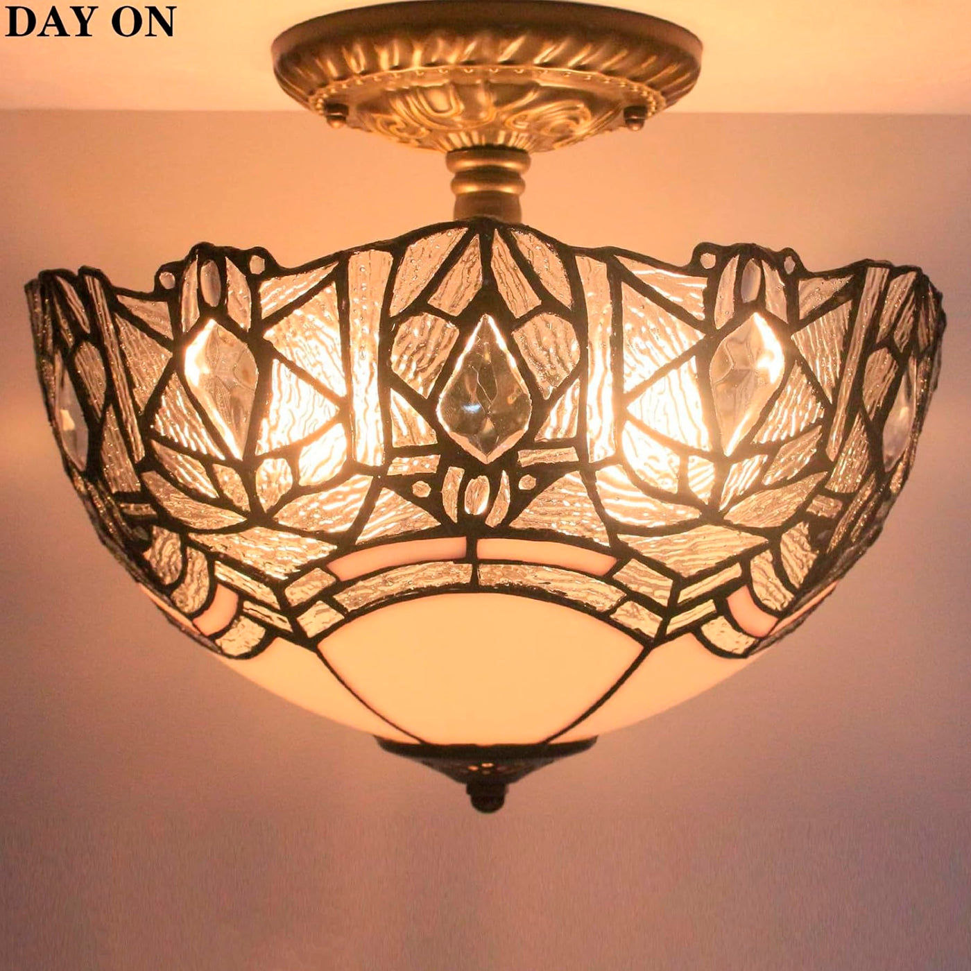 Werfactory Tiffany Ceiling Light Fixture, Crystal Bead, 12X11 Inch, White Stained Glass, Semi Flush Mount, S508W Series