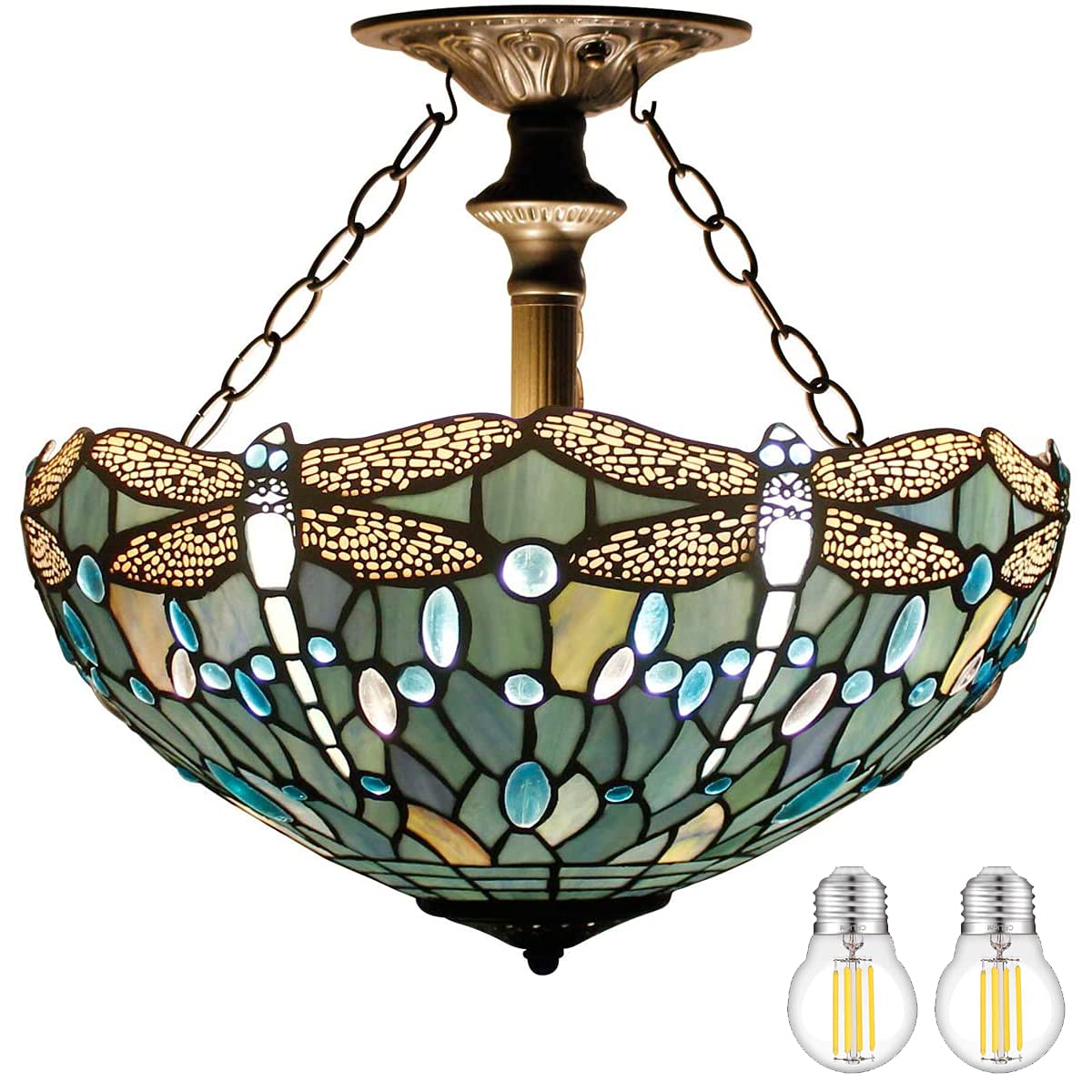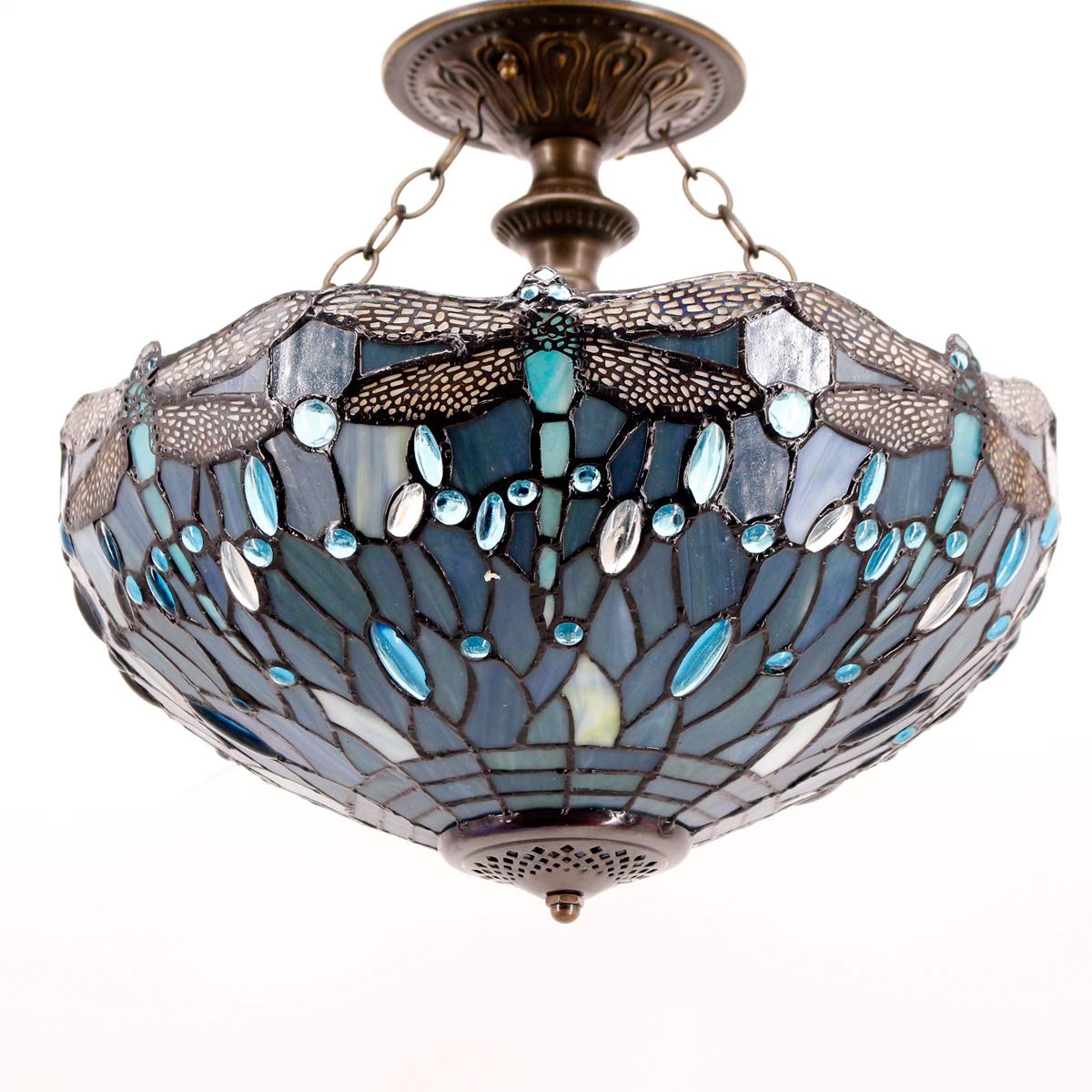 WERFACTORY Tiffany Ceiling Light Fixture, Sea Blue Glass, 16in Wide, 15in Height, Dragonfly S147 Series, Semi Flush Mount Lamp