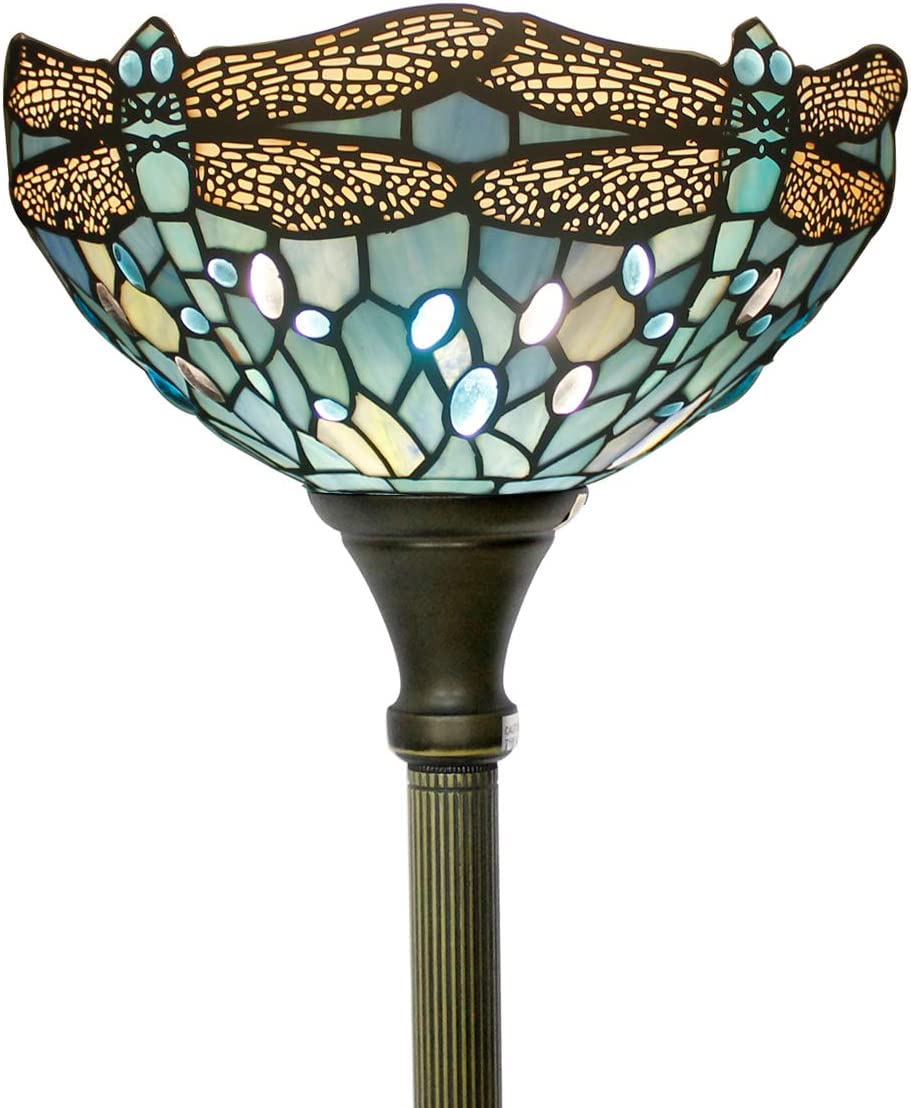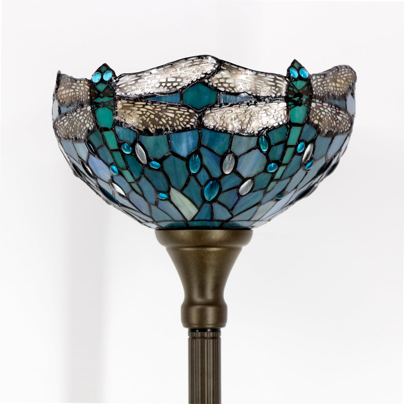 Werfactory Tiffany Floor Lamp Sea Blue Stained Glass Dragonfly Light 12X12X66 Inches Pole Torchiere Standing Corner Torch Upligh