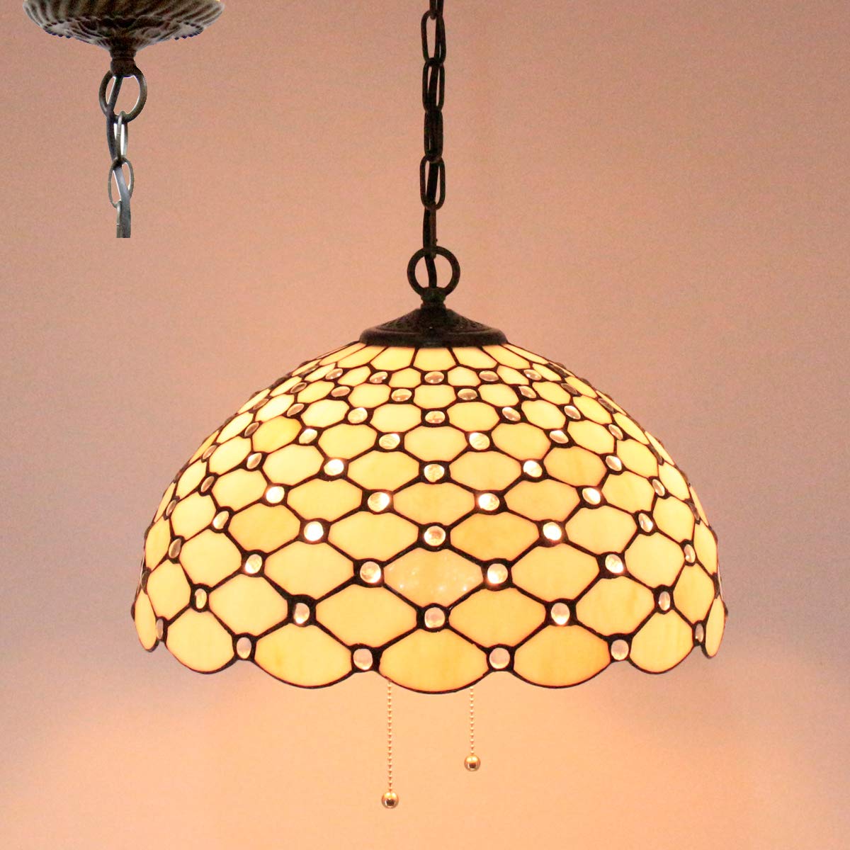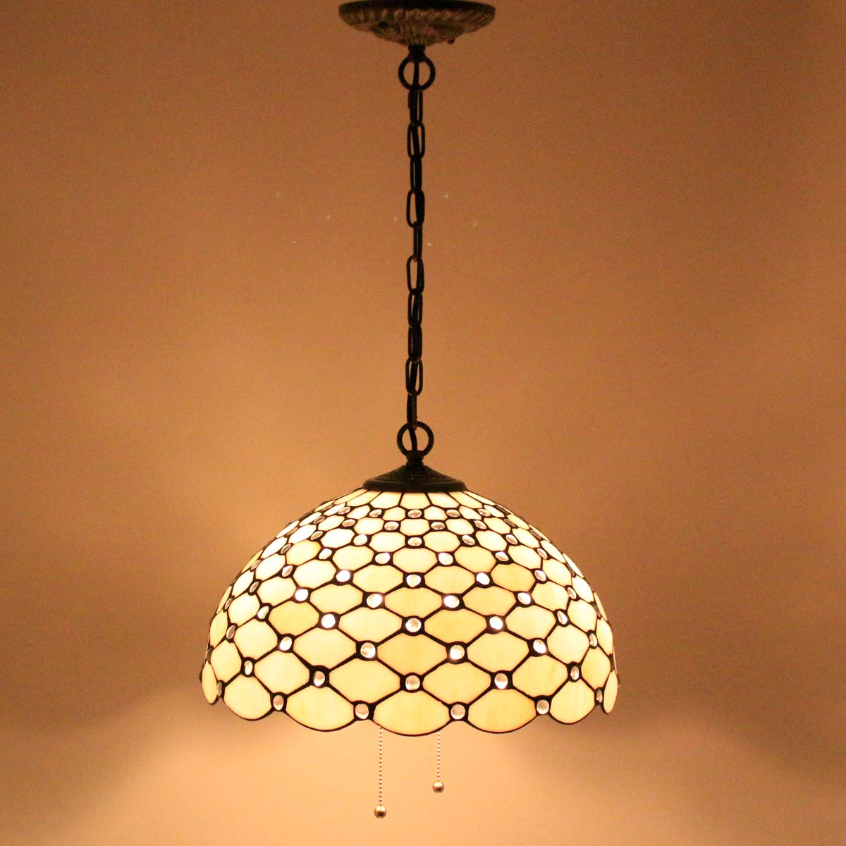 Q: Can I use this pendant light in a high ceiling room?A: Yes, the WERFACTORY Tiffany Pendant Light is designed with a 40-inch hanging chain, making it suitable for rooms with high ceilings. You can adjust the chain length during installation to fit your desired height.