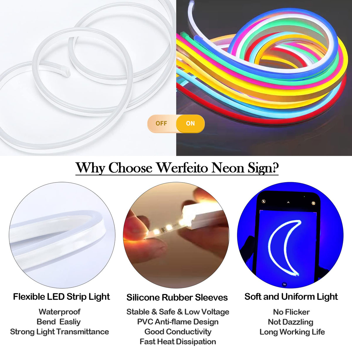 Q: What materials are the neon lights made of?A: The Werfeito neon lights are constructed from premium PVC, LED, and silicone, ensuring durability and a vibrant glow while being resistant to heat and breakage.