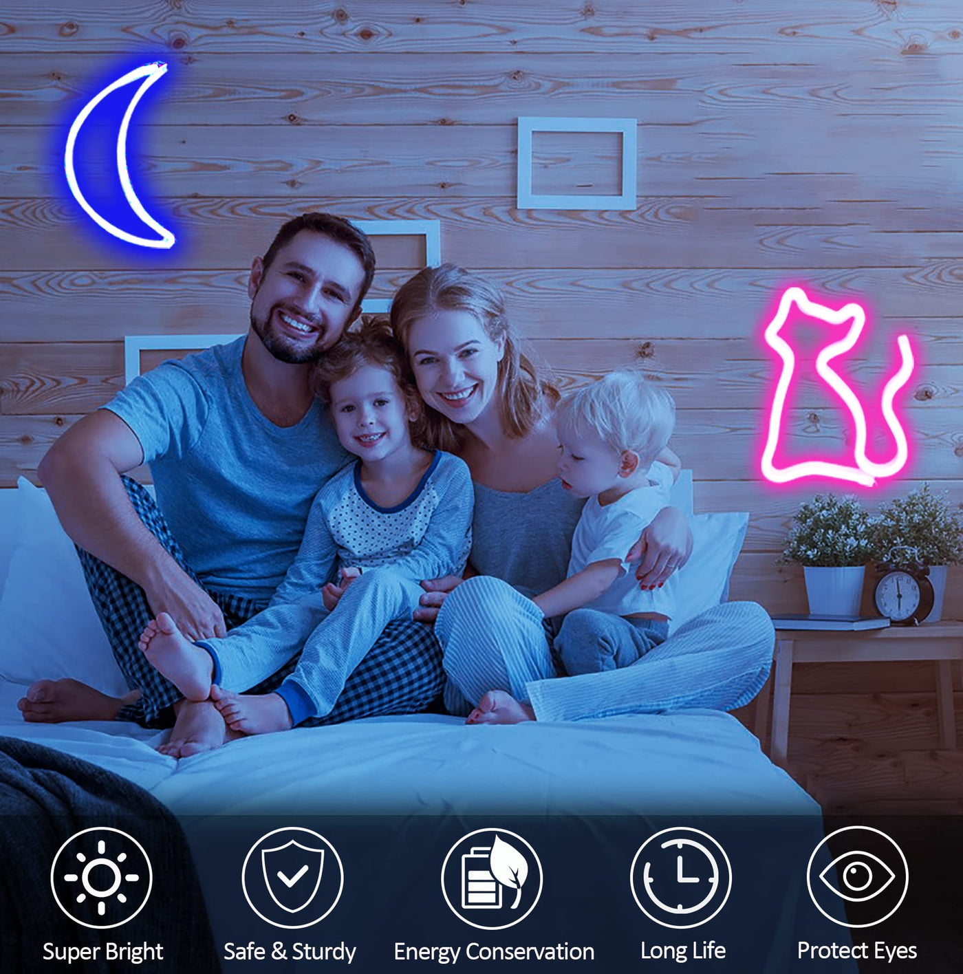 Decor Your Room with Cat Moon Neon Light Signs! Light up your home and add a romantic touch with these LED signs, perfect for bedroom wall decoration. Transform your space with warm and fantastic atmospheres that your family will love.