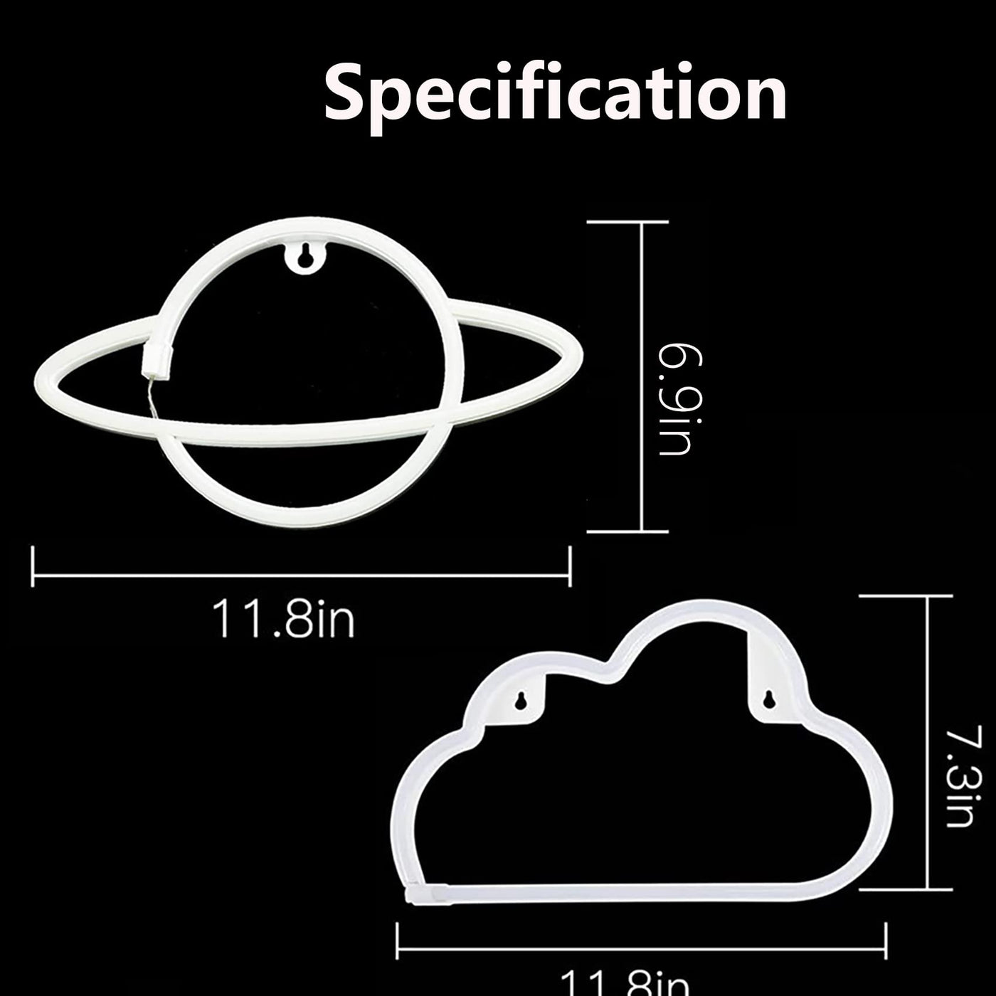 Q: What is the size of the Cloud and Planet Neon Signs?A: The Cloud Neon Sign measures 11.8 inches x 7.3 inches, and the Planet Neon Sign measures 11.8 inches x 6.9 inches, making them ideal for various decorative spaces.