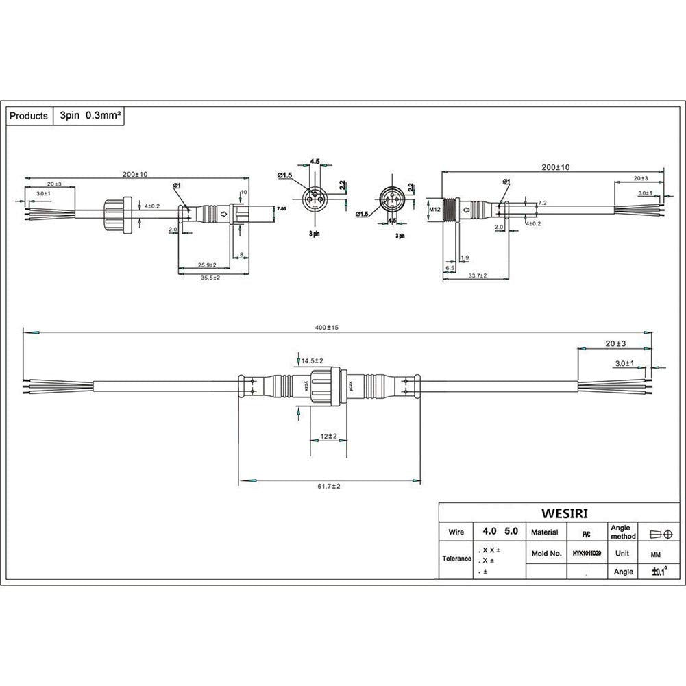 Product Description: The mode: 3Pin-15mm Nut Pin Models:3Pin Application Cable Size:0.3mm Rated voltage:220V Rated current:3A Waterproofing grade:IP65 Fireproofing grade:UL94V-0 The largest size of nut:15mm Standard Size: Male (including waterproof head) L = 200mm Female (including waterproof head) L = 200mm Package: 5 Pairs 3pin-15mm nut waterproof connectors We have 2/3/4/5 pin ,selling on the store ,if you need please check. If you need special length or other cable ,please contact us to customize.