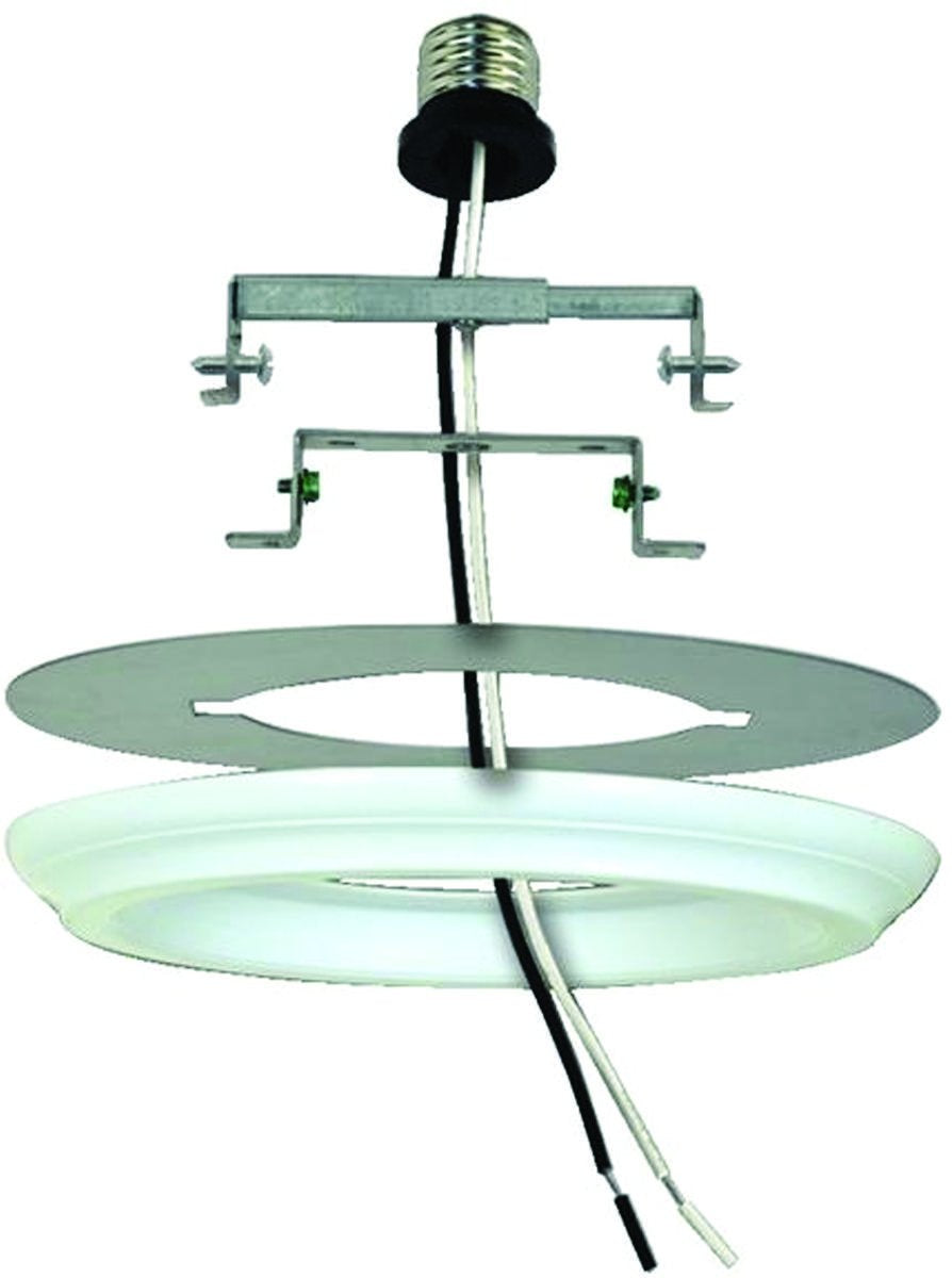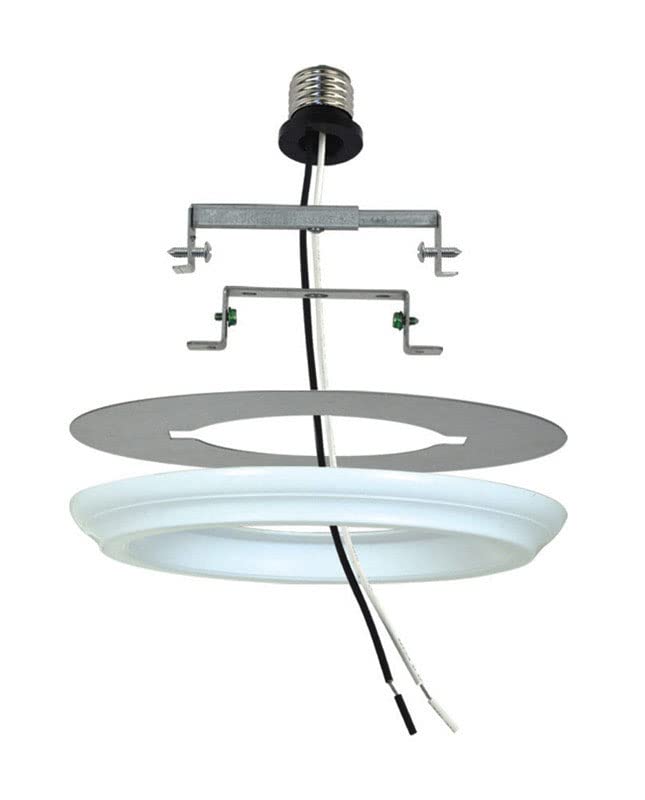 Convert old, unused can lights with this innovative light conversion kit. In just minutes you can convert your can light to accept hanging lights, ceiling light fixtures and other decorative lighting. Perfect for entry lighting, workshops, carports or wherever can lighting has been installed. This Recessed Light Converter adjusts to any can size between to 4" and 6" cans. 50 pound load rating for ceiling fixtures. Includes a decorative medallion cover. Please note: this kit is designed for incandescent lighting only. Mount only to construction cans with bar hangers. Can light conversion kit. White finish. Adjusts to any can size between to 4" and 6" cans. Includes mounting hardware and wires. 50 pound load rating. 8" wide canopy. 6" wide.