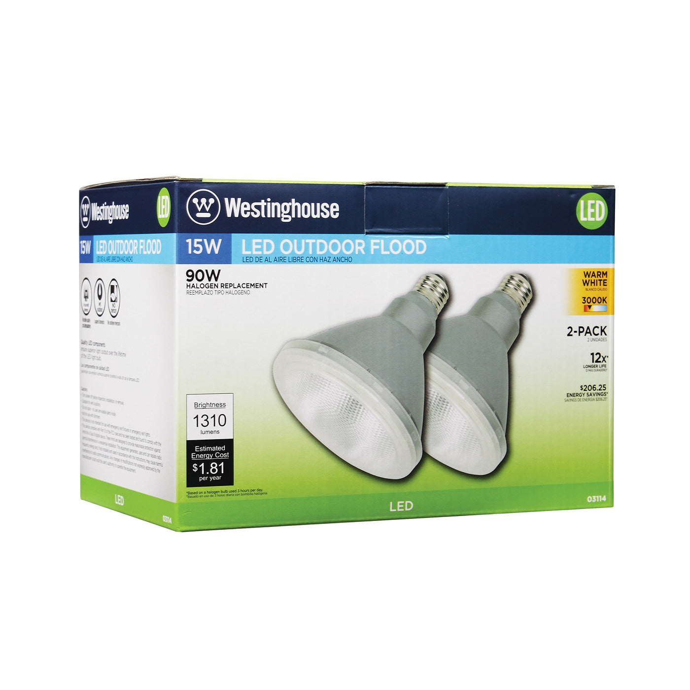 The Westinghouse 15-Watt PAR38 LED Flood Outdoor Wet Location Light Bulb 2-Pack with Medium Base can reduce energy and operating costs up to 83 percent compared to standard incandescent bulbs with the same light brightness. Each of these LEDs saves about $205* in energy costs over the lifetime of the bulb compared to an incandescent bulb. Each PAR 38 flood light lasts over 22 years and costs about $1.80 a year to operate, versus a 90-Watt incandescent bulb, which costs about $11 a year to operate and lasts less than 2 years. These PAR38 LED light bulbs are lighter than other LEDs making them the perfect replacements in outdoor security lights. LEDs contain no harmful mercury. Westinghouse is a trusted, global brand. Westinghouse knows lighting and offers products with exceptional quality, reliability and functionality. *Based on burning 3 hours per day at 11 cents per kilowatt hour for 22 years or 25,000 hours. Product reference number 03114.