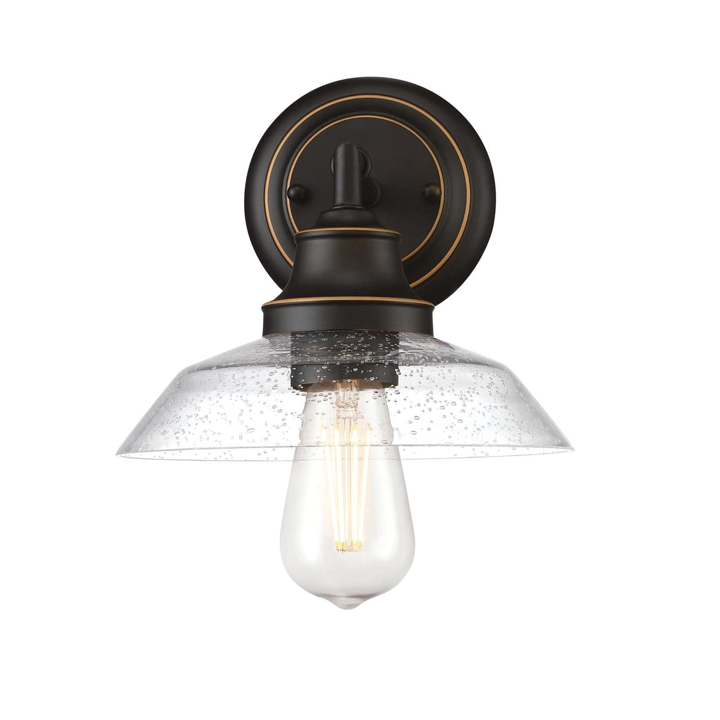The vintage-style Westinghouse Iron Hill wall light is perfect with any design style, from modern to farmhouse. Oil rubbed bronze finish with rich bronze highlights adds a rustic farmhouse appeal. Install this wall fixture in the bathroom or bedroom for a classic touch. Enjoy the fixture's straightforward style and welcoming light diffused through a hand-blown, clear seeded glass shade. Westinghouse is a trusted, global brand. Westinghouse knows lighting and offers products with exceptional quality, reliability, and functionality. Product reference number 61165.