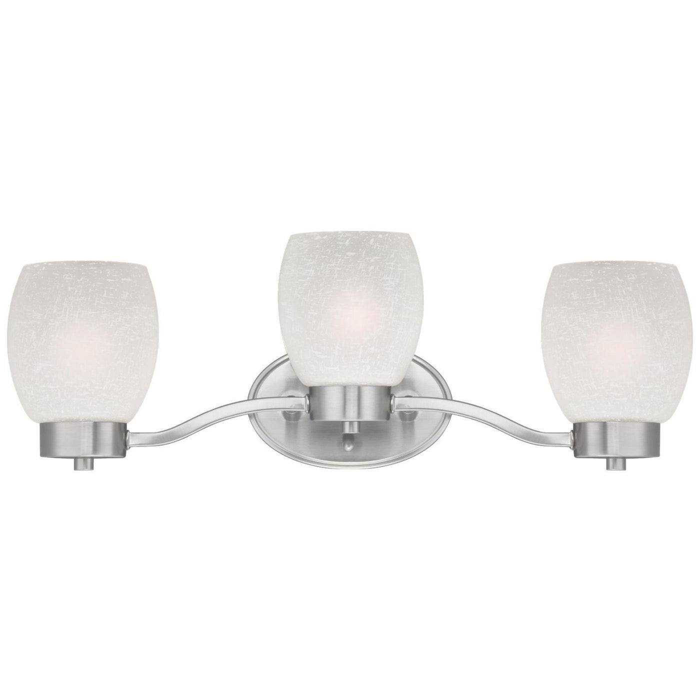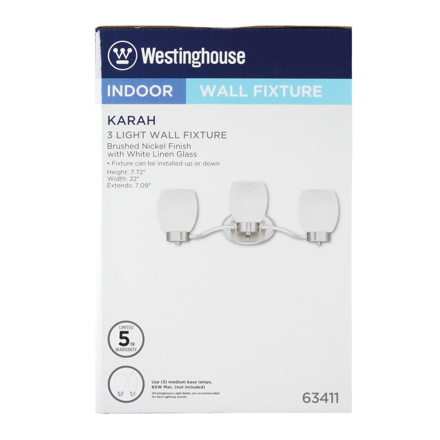 Bring the graceful elegance of the Westinghouse Karah Three-Light Wall Fixture to your home. This fixture features a brushed nickel finish and a transitional, elegant design. Three white linen barrel shades add textural interest and provide inviting illumination. Install this wall fixture in the bathroom, vanity or dining room for a refined touch. Its larger size works well for bigger rooms. You can position the fixture up or down to suit your needs. Wherever you install it, you will enjoy the fixture's graceful style and welcoming light. The Karah three-light wall fixture is 7-3/4 inches in height by 22 inches wide. It extends 6-3/4 inches from the wall. It uses three medium-base bulbs, 60-watt maximum (not included). This indoor light fixture is ETL/CETL listed for safety and is backed by a five-year limited manufacturer's warranty defects in materials and workmanship. Westinghouse is a global brand with a simple philosophy: make life easier for everyone who buys its products. Westinghouse products are designed for exceptional quality, reliability, and functionality. Product reference number 63411.