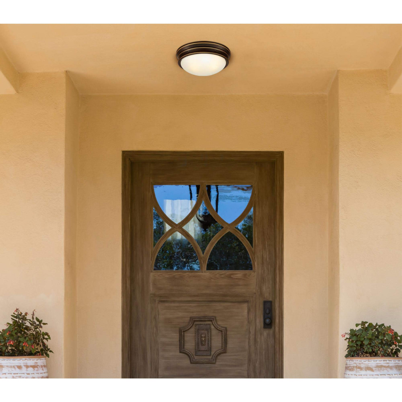 The Westinghouse Meadowbrook flush mount ceiling light features an oil rubbed bronze finish with highlights. With a hint of nautical style, this flush mount lighting adds a unique look to any room. Featuring a frosted half-moon dome glass, this traditional ceiling fixture creates lovely illumination in a hallway, foyer, living room, dining room or bedroom. Ideal for small to medium size areas, this flush mount ceiling light fixture can be installed on low and high ceilings. Westinghouse is a trusted, global brand. Westinghouse knows lighting and offers products with exceptional quality, reliability and functionality. Product reference number 63706.