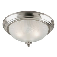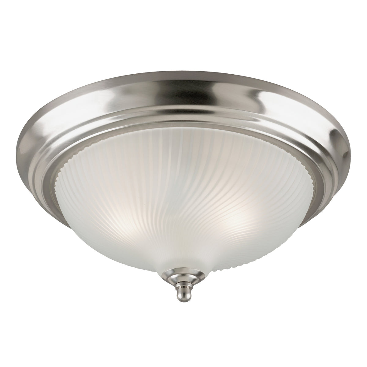 With an elegant brushed nickel finish and frosted swirl glass, this Westinghouse Two-Light Flush-Mount Interior Ceiling Fixture adds a tasteful touch to any decor. The shining, subtly carved base sets off the flowing, matte glass, which adds a fanciful edge to this fixture. A rounded finial provides a traditional touch. The fixture mounts flush, allowing it to work well with low and high ceilings alike. No matter where you place it, you will enjoy the sleek look of this fixture. The fixture's intermediate dimensions make it ideal for rooms of all sizes. The fixture is 6-1/8 Inch high by 13 Inch in diameter. It uses two medium-base light bulbs, 60-watt maximum (not included). This Westinghouse interior fixture is Underwriters Laboratories listed for safety. It is backed by a five-year manufacturer's warranty against defects in materials and workmanship.
