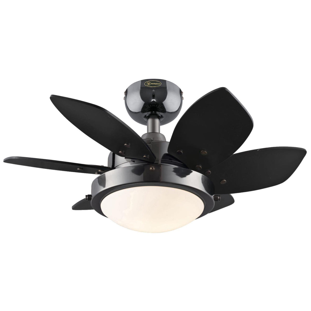Product DescriptionAdd comfort to your home with this Westinghouse Quince Two-Light 24-Inch Reversible Six-Blade Indoor Ceiling Fan. With a sleek gun metal finish, reversible black/graphite blades, and opal frosted glass shade, this ceiling fan will provide a casual focal point for any small-size room.Ideal for rooms up to 80 square feet (8 by 10 feet) with standard 8-foot ceilings, this fan features a 153-by-9-millimeter silicon steel motor with dual capacitor. Three fan speeds (high/medium/low) and a reversible switch help keep you comfortable. In warm weather, you can run the ceiling fan counterclockwise to stay cool. In cold weather, you can run it clockwise to recirculate warm air from the ceiling and eliminate cold spots and drafts. The Quince is remote control adaptable for added convenience.The fan provides airflow of up to 1,270 cubic feet per minute (cfm). It is rated to operate at 25 watts at high speed (without the lights), which gives it an airflow efficiency rating of 39 cfm per watt. (As a comparison, 36- to 48-inch ceiling fans have airflow efficiencies ranging from approximately 71 to 86 cfm per watt at high speed.)This Westinghouse ceiling fan is backed by a lifetime motor warranty and a two-year warranty on all other parts. Product reference number 72243.From the ManufacturerAdd comfort to your home with this Westinghouse Lighting Quince Two-Light 24-Inch Reversible Six-Blade Indoor Ceiling Fan. With a sleek gun metal finish, reversible black/graphite blades, and opal frosted glass shade, this ceiling fan will provide a contemporary focal point for any small-size room. Ideal for rooms up to 80 square feet (8 by 10 feet) with standard 8-foot ceilings, this fan features a 153-by-9-millimeter silicon steel motor with dual capacitor. Three fan speeds (high/medium/low) and a reversible switch help keep you comfortable. In warm weather, you can run the ceiling fan counterclockwise to stay cool. In cold weather, you can run it clockwise to recirculate warm air from the ceiling and eliminate cold spots and drafts. The Quince is remote control adaptable for added convenience. The fan provides airflow of up to 1,270 cubic feet per minute (cfm). It is rated to operate at 25 watts at high speed (without the lights), which gives it an airflow efficiency rating of 39 cfm per watt. This Westinghouse Lighting ceiling fan is backed by a lifetime motor warranty and a two-year warranty on all other parts. What's in the Box Quince indoor ceiling fan, 78-inch lead wire, 4-inch length by 3/4-inch diameter down rod, and two candelabra-base 40-watt G16-1/2 light bulbs.