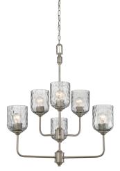Q: What is the finish and material of the chandelier?A: The Westinghouse Basset Chandelier features a Dark Pewter finish and is complemented by hand-blown smoke grey hammered glass shades, offering a striking appearance and beautiful illumination.