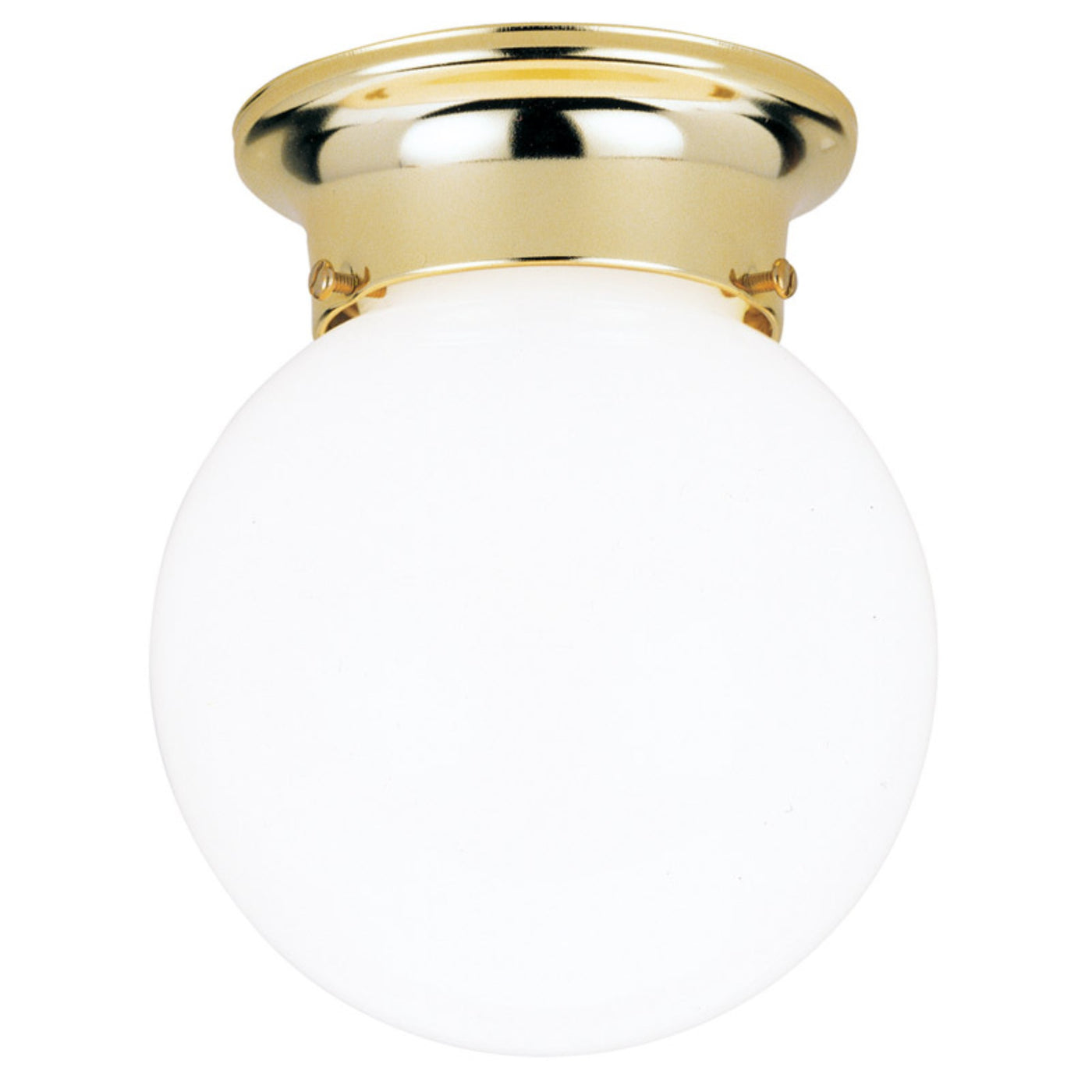 This ceiling fixture features a polished brass finish that adds a touch of elegance to its design. The white glass globe softens the light, creating a cozy ambiance while ensuring ample illumination. Measuring 7-1/4 inches in height and 6 inches in diameter, this fixture is compact yet impactful, making it suitable for various room sizes and styles. It operates with one medium-base light bulb, with a maximum wattage of 60 watts, allowing for flexibility in choosing the type of bulb that best suits your lighting needs.