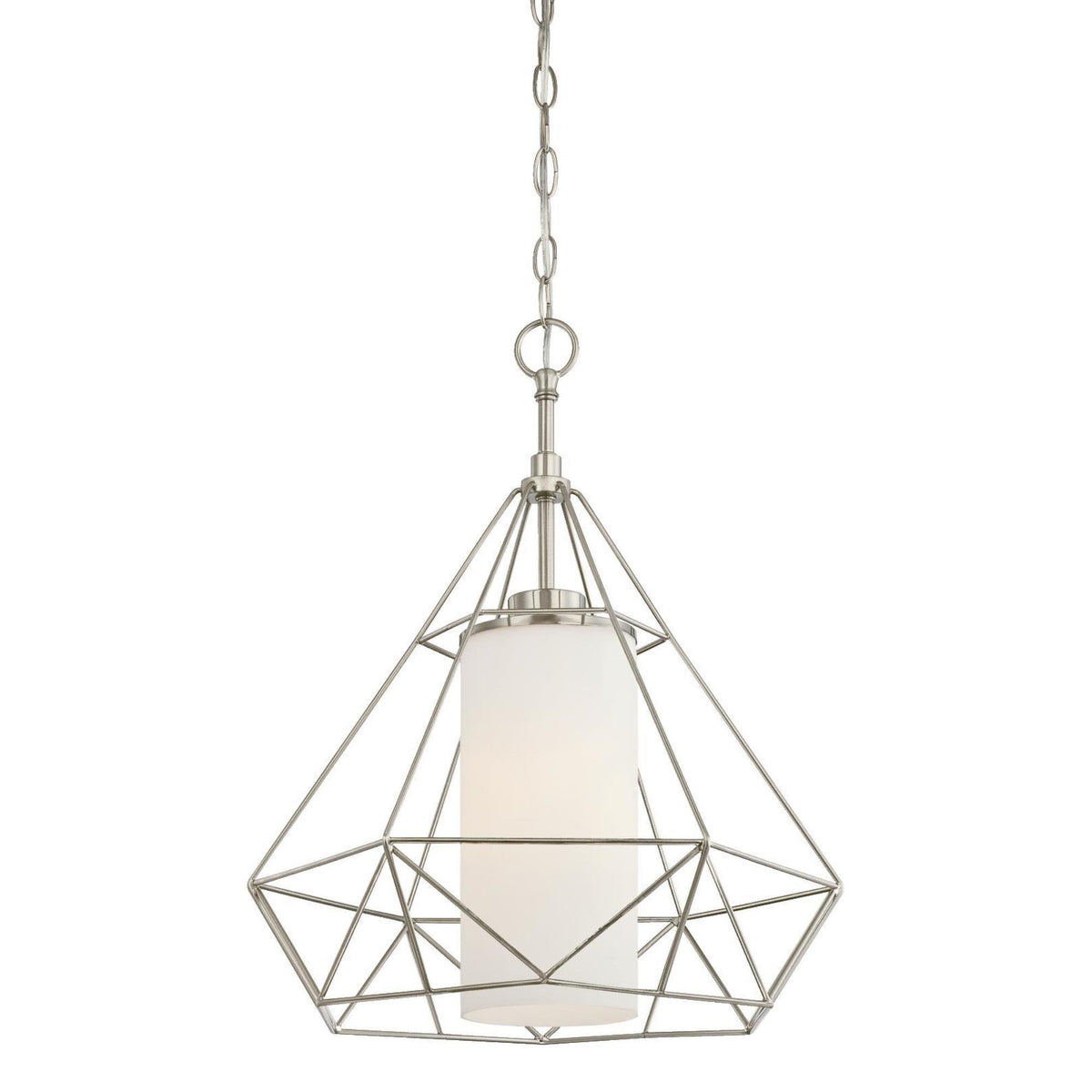 FeaturesOne-light indoor pendantFrosted Opal glassAdd a touch of artistry to any room with this geometric pendant lightBrushed nickel finishIncludes:Medium E26 Base Lamps - 1Specificationscolor: WhiteHeight: 19ም"Diameter: 15ቓ"chain: 36"cord Length: 60"Wattage: 60WWeight: 7ረ lbs