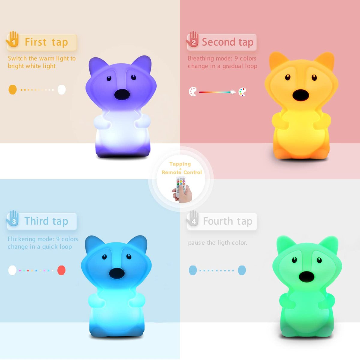LED Fox Night Light for Kids The silicone part is removable and washable.Safe LED:With 4 LEDs built in the plastic base,you dont have to worry about the bulb becoming too hot to touch the baby night light with your hands.Double control:Remote control+tapping control helps control the rechargeable night light easily.Specifications:Product size: 4.33x4.33x5.52inchesNet weight: 140gVoltage: DC 5VRated power: 0.35Wport: USB (with USB cable)Working time:12-16 hours(depends on mode and brightness you choose)Instructions for use: Press the power button to turn on the cute night light in warm white mode.The first tap will switch the light to bright white light.The second tap will start to slowly change the color.The third tap will speed up the color change.The fourth tap will pause the ligth color, and continue tapping the squishy night light to restart the cycle. Press the power button again to turn off the kids night light.Package includes:1 X LED night light (Fox ); 1 X Type-C USB cable (5v / 1A); 1 X User Manual; 1 X remote control.Notes: 1.Do not disassemble the internal lamps.