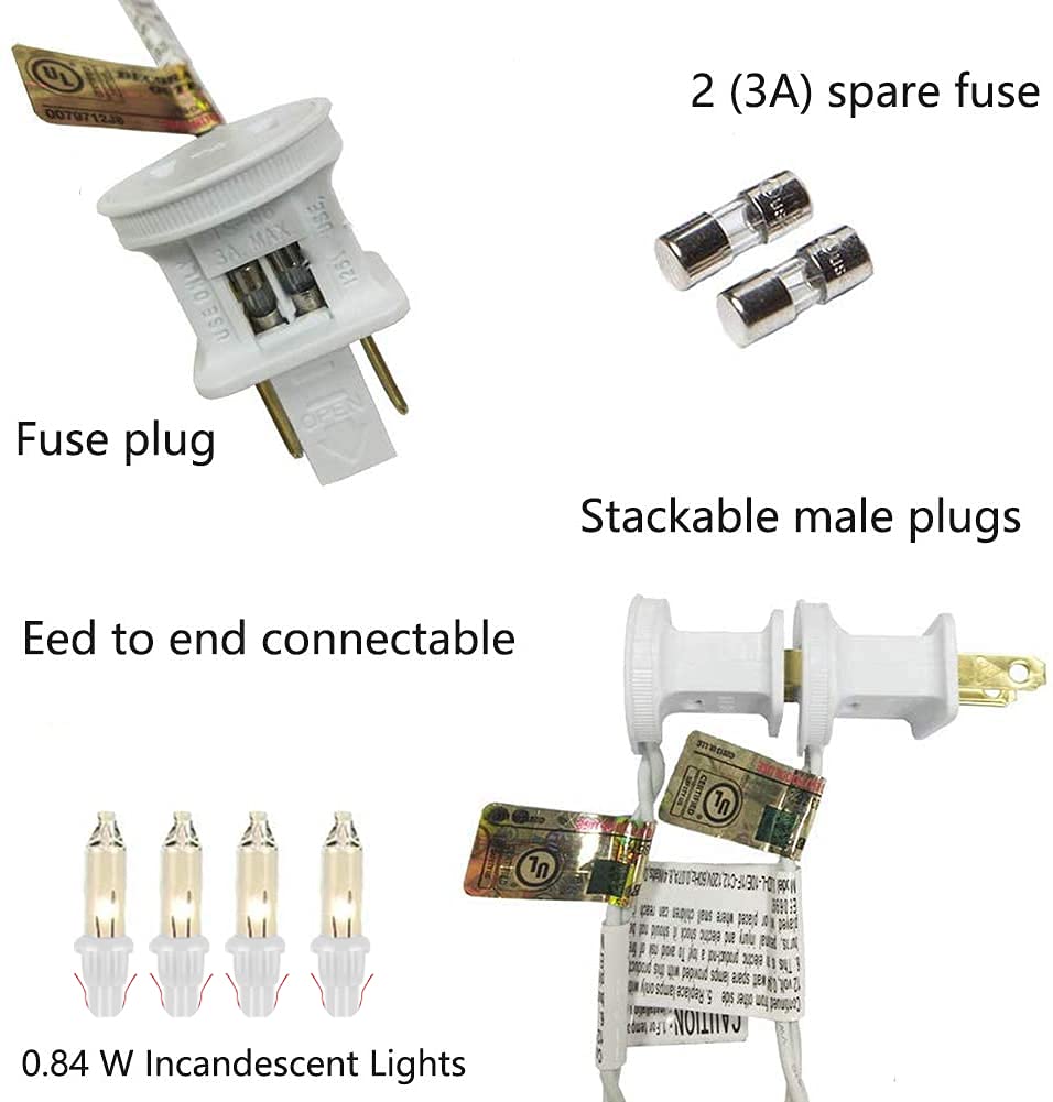 Specifications: Color: clear bulb,white wire Quantity: 1Pack of 10 Rated: 8.4W Length: 8.5ft Design: end to end connection, fuse plug, 2 replacement fuses Dimension: 24 in x 8 in x 6 in If you have any quality problems, please don’t hesitate to contact us!