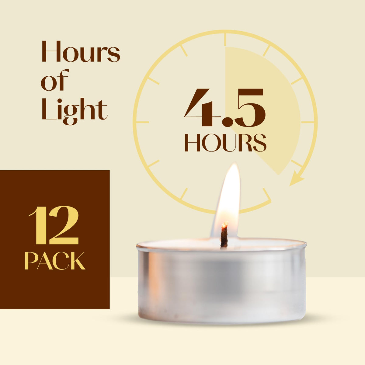 Q: What is the burn time of the White Scented Tealight Candles?A: The White Scented Tealight Candles have a generous burn time of 4.5 hours, allowing you to enjoy their delightful aromas for an extended period.