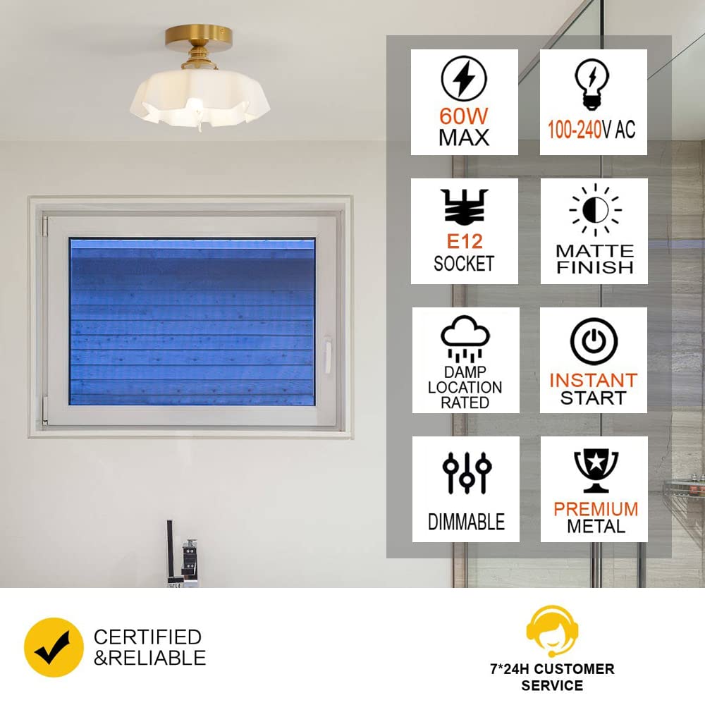 Q: How does the design of this ceiling light enhance home decor?A: The unique design of this semi flush mount ceiling light features a white glass shade inspired by blooming flowers and a brass gold base with knurled design elements. This combination adds a modern farmhouse style to your space, creating a soft and pleasant ambiance in any room.