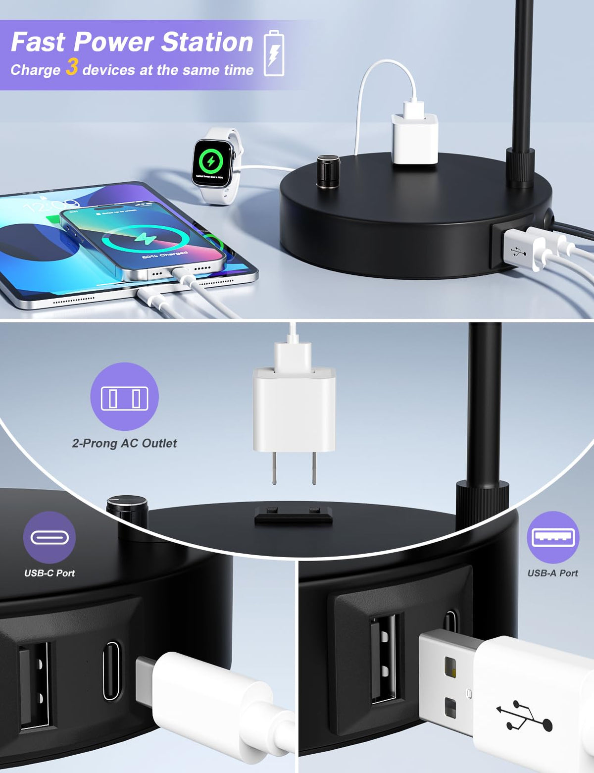 White Side Table Lamp With Usb Port And Outlet, Dimmable Nightstand Bedside Lamps With Linen Lampshade, Desk Lamp For Bedroom, L