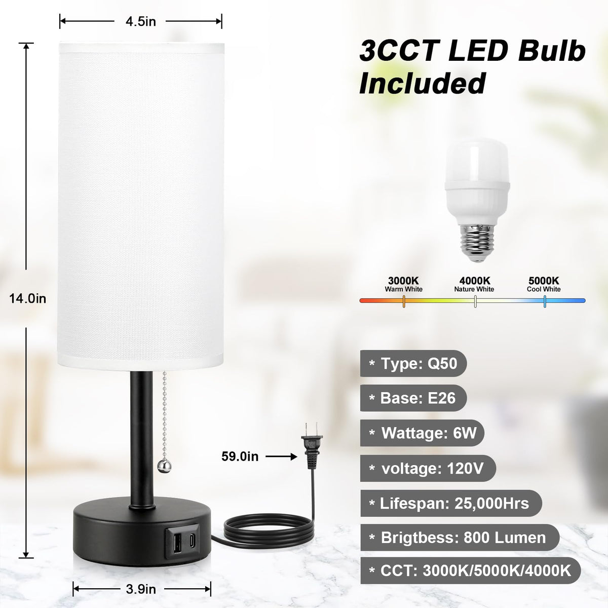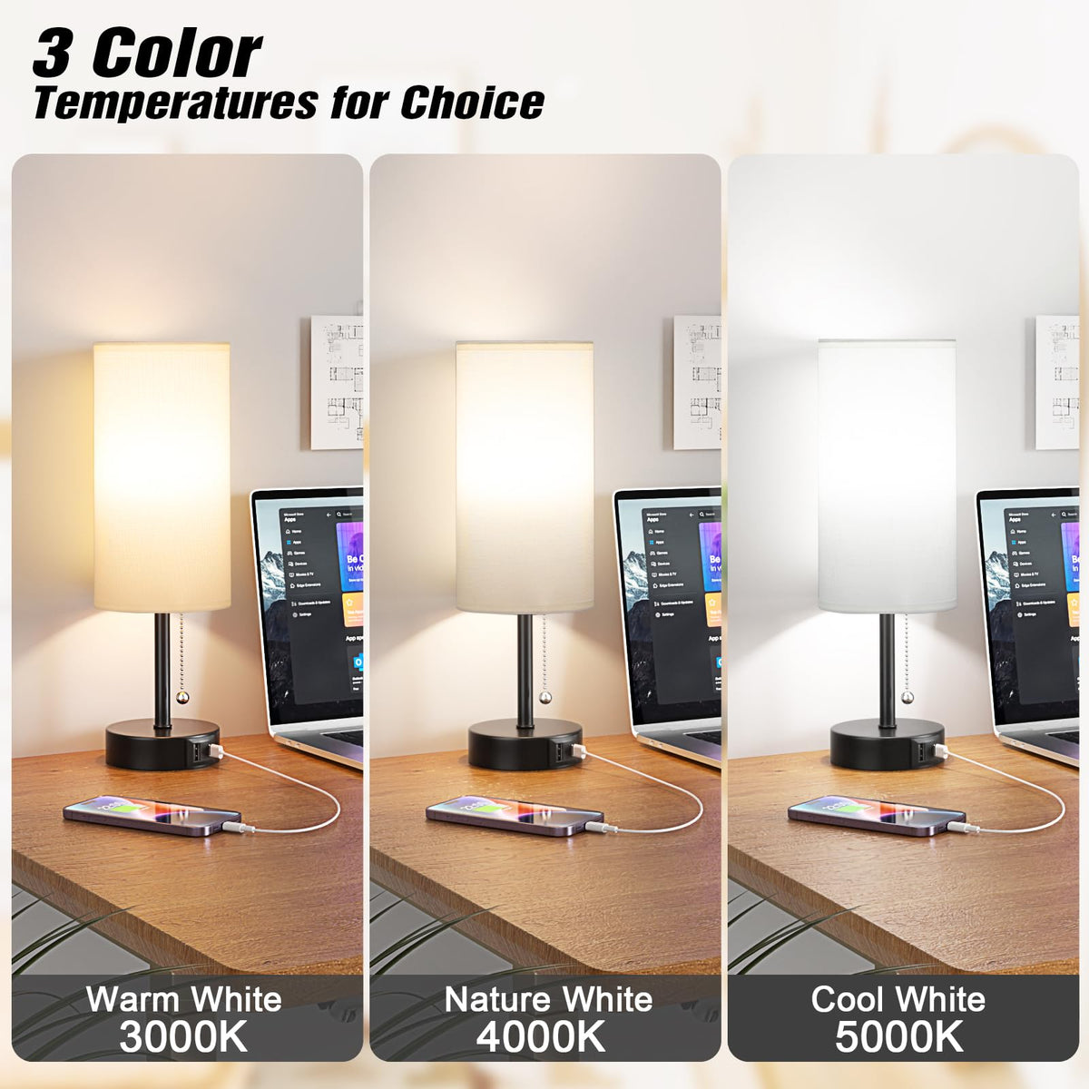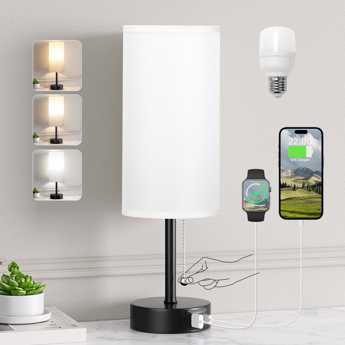 White Table Bedside Lamp For Bedroom Nightstand - Small Lamp With Usb A + C Charging Port, 3 Color Temperatures Pull Chain Night